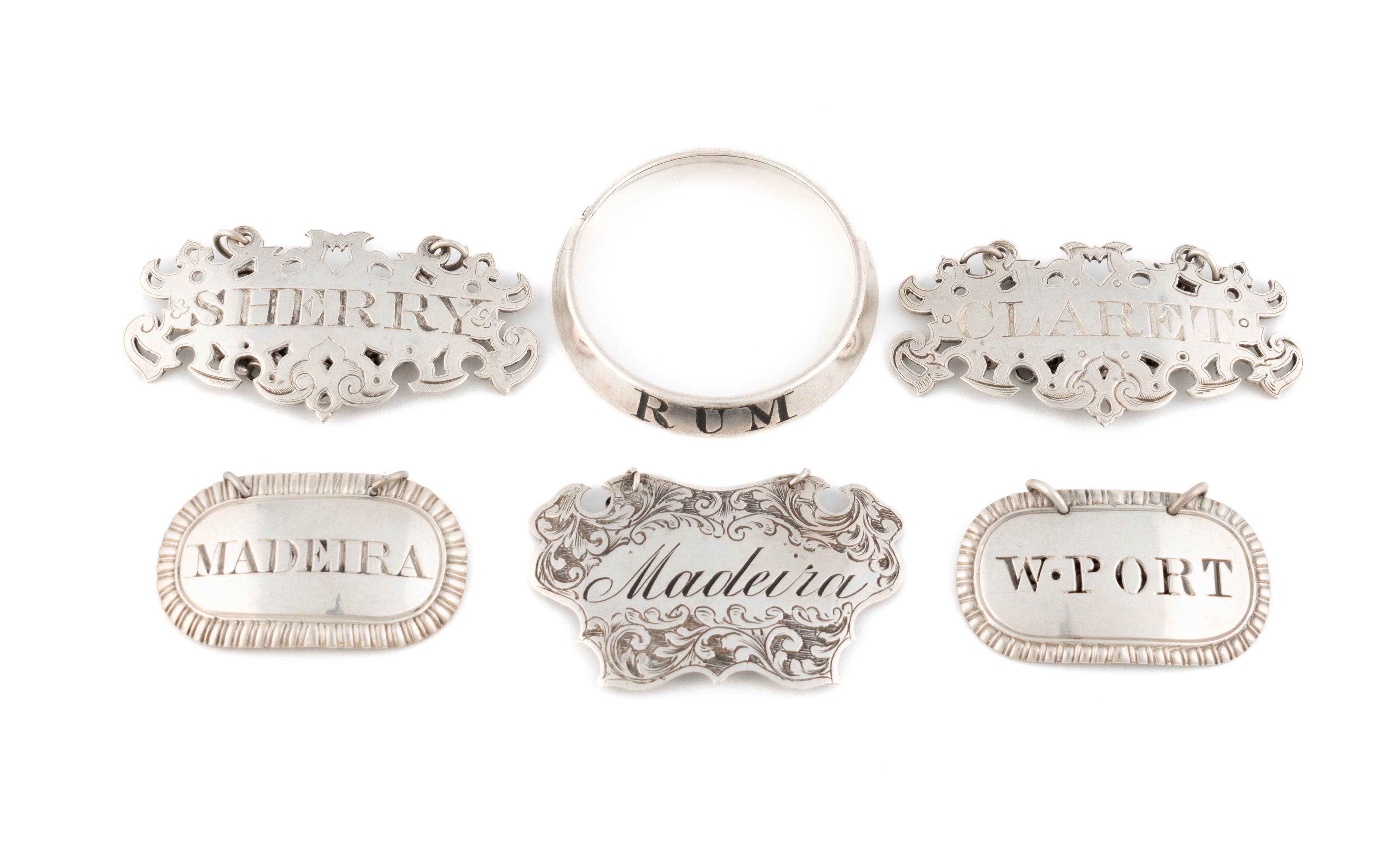 comprising: one by Phipps & Robinson, London 1808, pierced 'W.Port', one by Thomas & James Phipps, London 1816, incised 'Madeira', a pair by Rawlings & Summers, London 1842, incised 'Sherry' and 'Claret', one by George Unite, Birmingham 1853, and an unmarked ring neck, incised 'Rum', total approx. weighable 2.3oz. (6)