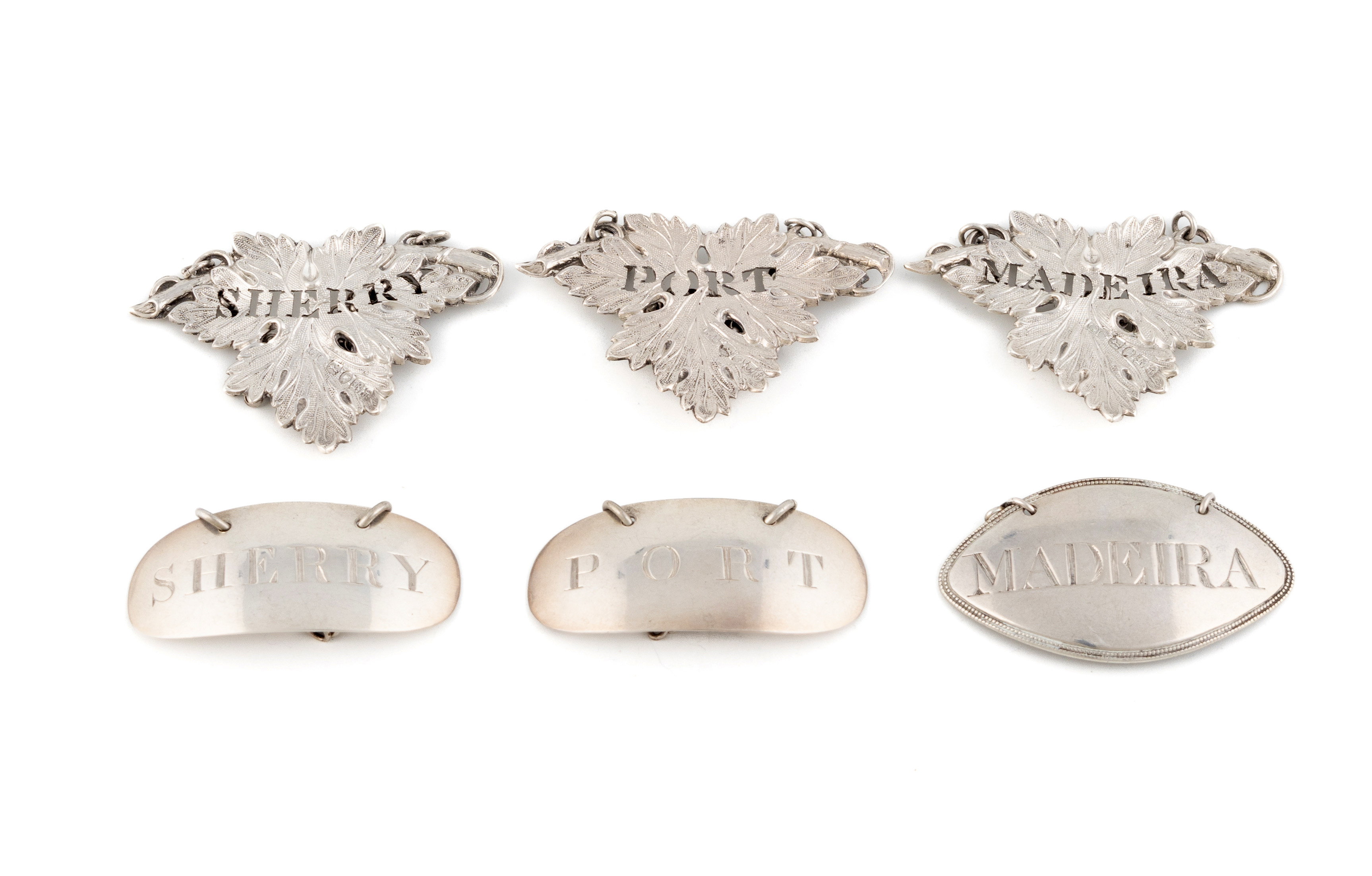 A collection of antique silver wine labels,