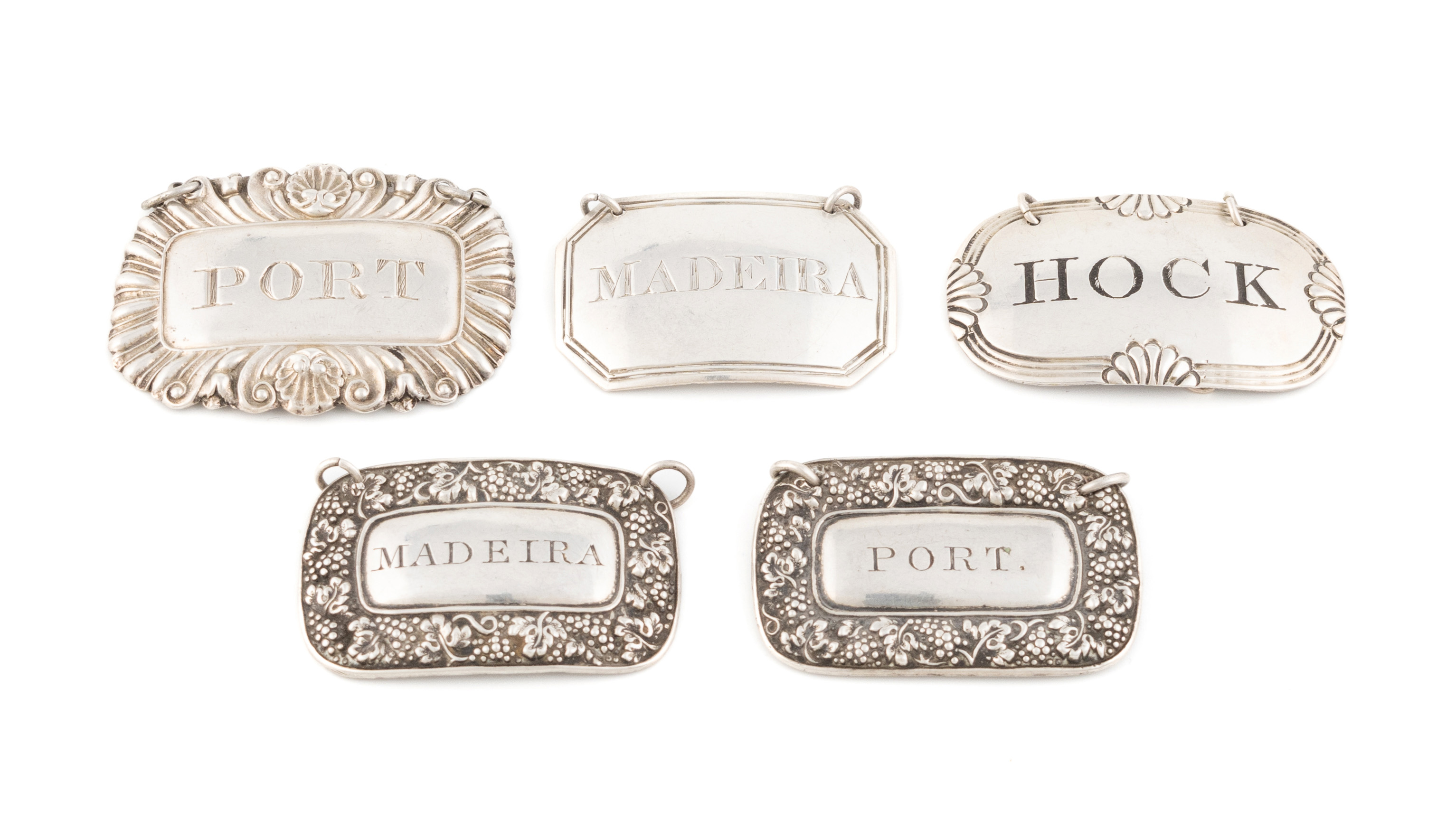comprising: a pair by Joseph Taylor, Birmingham 1824, incised 'Port' and 'Madeira', one by Charles Rawlings, London 1818, incised 'Hock', one by William Knight, London 1836, incised 'Hock' and one by John Mitchell, Glasgow 1824, incised 'Madeira', total approx. weight 1.6oz. (5)