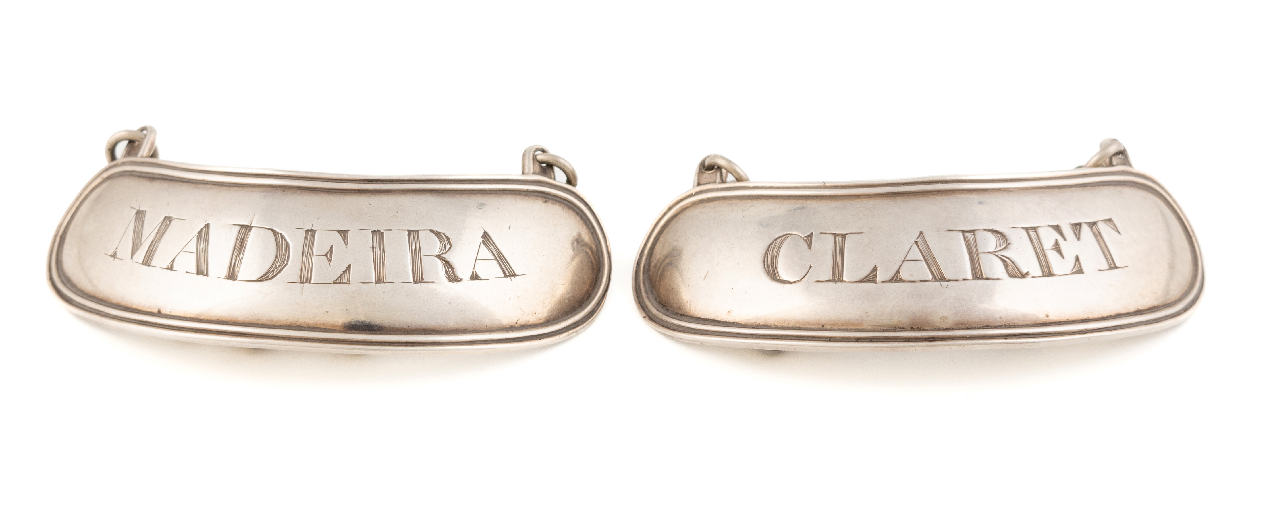 oblong form with a reeded border, incised 'Claret' and 'Madeira', length 7cm, total approx. weight 0.9oz. (2)