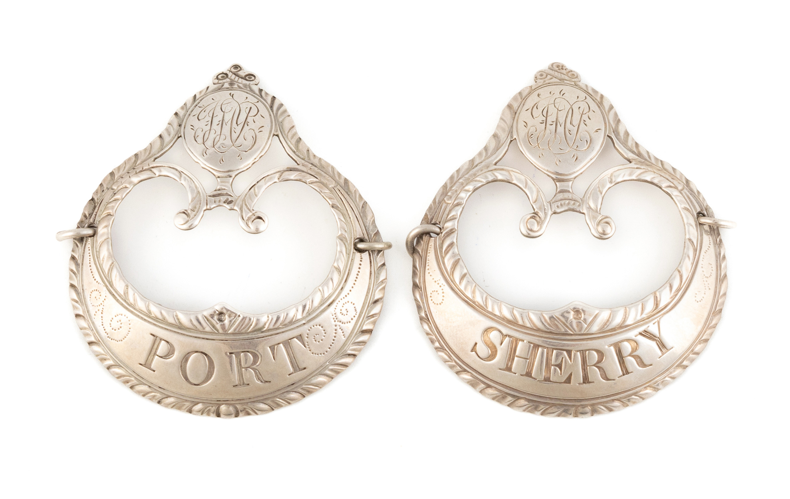 scroll form, with a raised pediment and urn, engraved with initials, feather-edge border, incised 'Port' and 'Sherry', height 5.1cm, total approx. weight 0.7oz. (2)