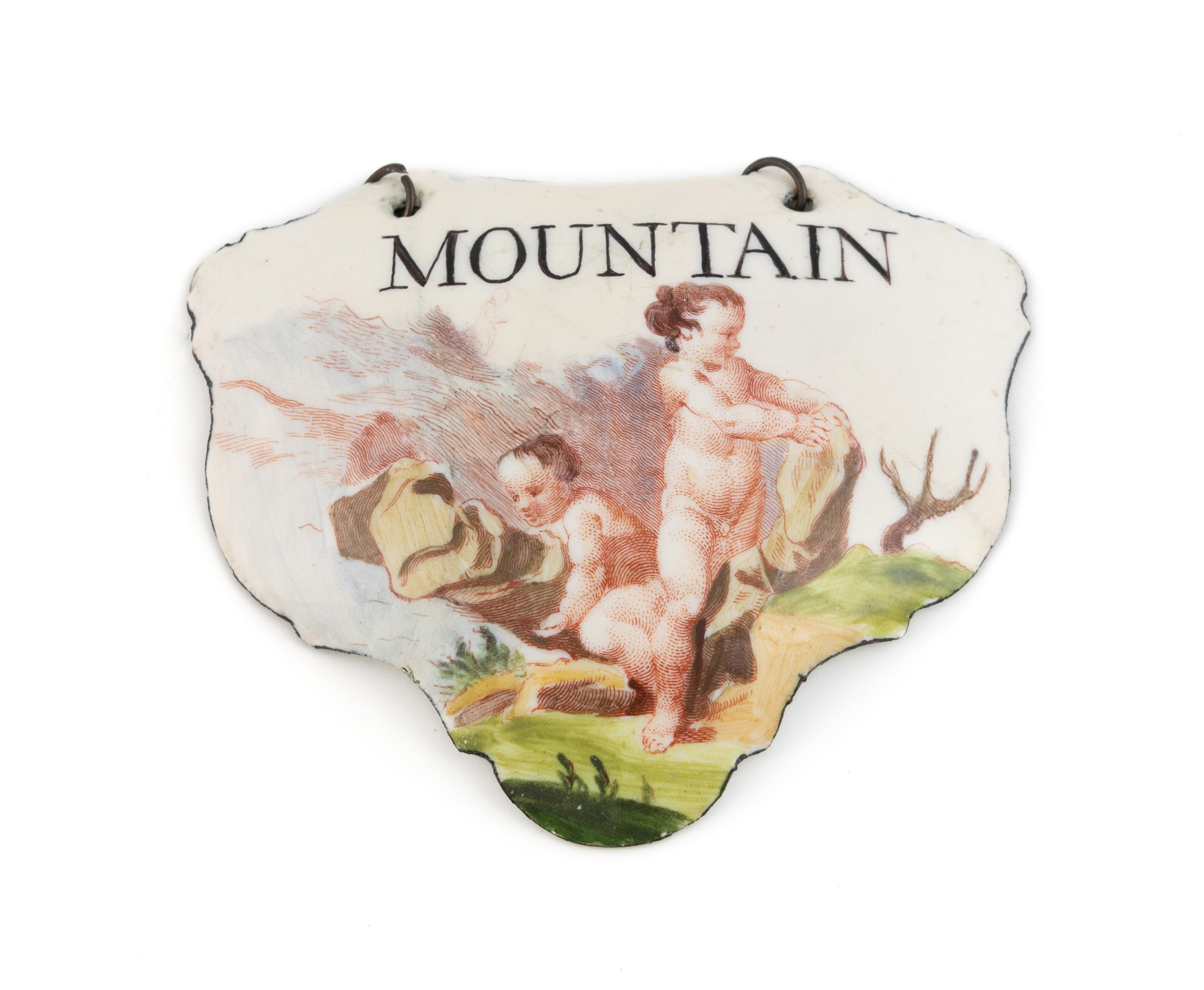 escutcheon form with a scene of two cherubs in a rural scene, titled 'Mountain', length 7.2cm.