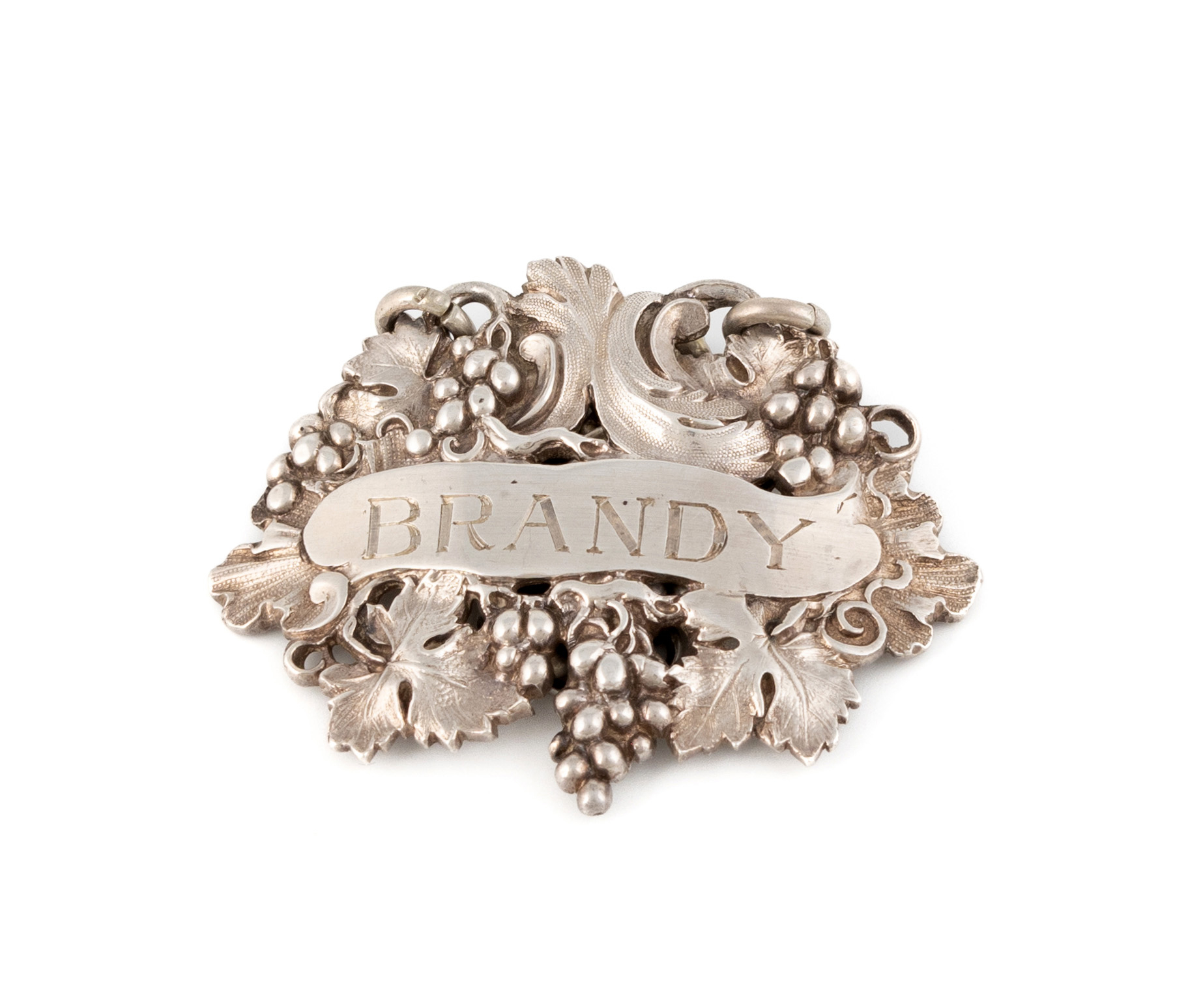 shaped oval form with scroll grape and vine decoration, incised 'Brandy', length 5.8cm, approx. weight 1.2oz.