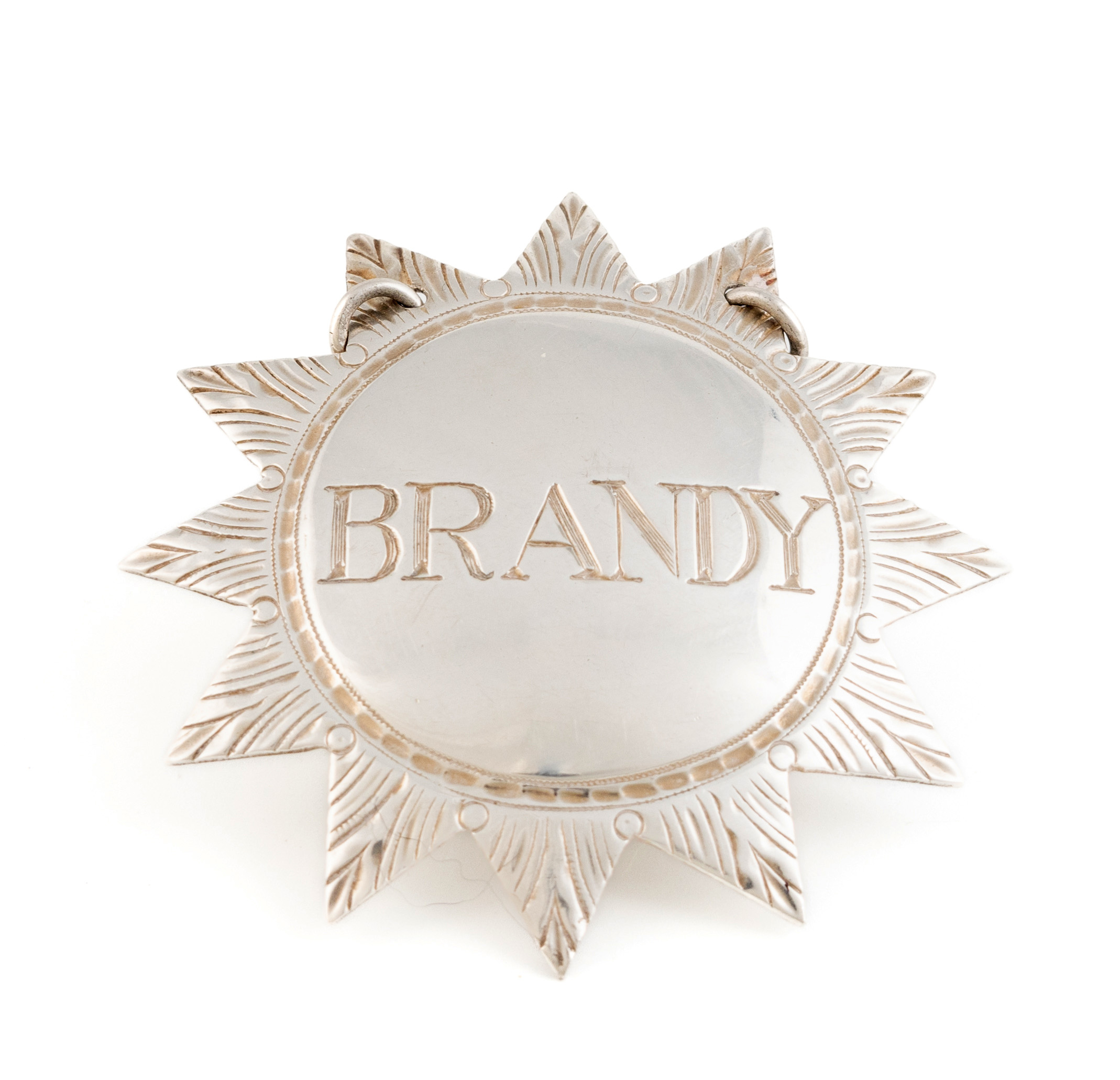 twelve pointed star form with an engraved decorative border, incised 'Brandy', length 5cm, approx. weight 0.3oz.