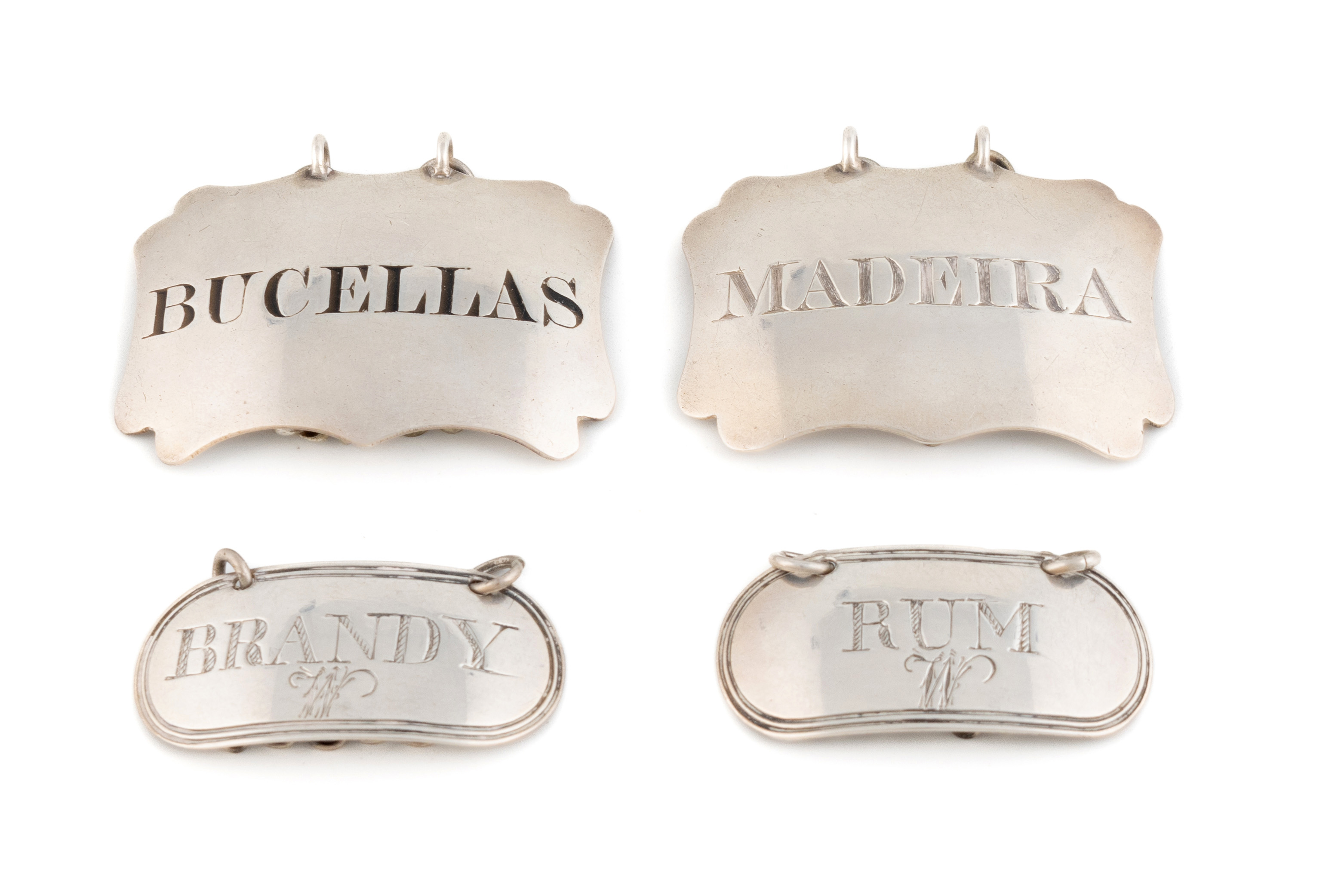 oblong form with reeded borders, engraved 'W', incised 'Brandy' and 'Rum', plus a Victorian pair by Reily & Storer, London 1840, incised 'Maderia' and 'Bucellas', length 5.1cm, total approx. weight 1.6oz. (4)