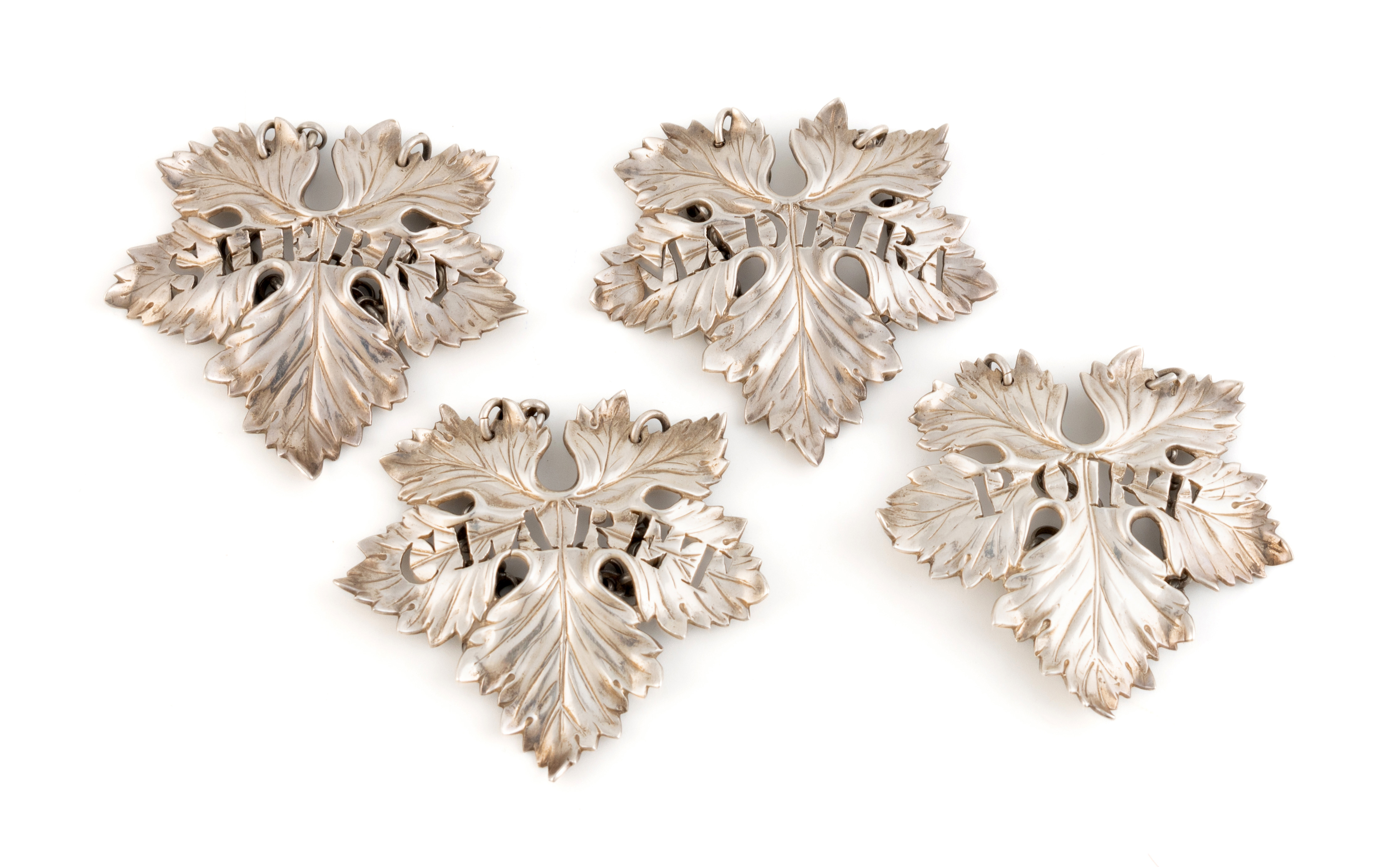 vine leaf form with engraved decoration, pierced 'Port', 'Claret', 'Madeira' and 'Sherry', length 6.4cm, total approx. weight 3.3oz. (4)