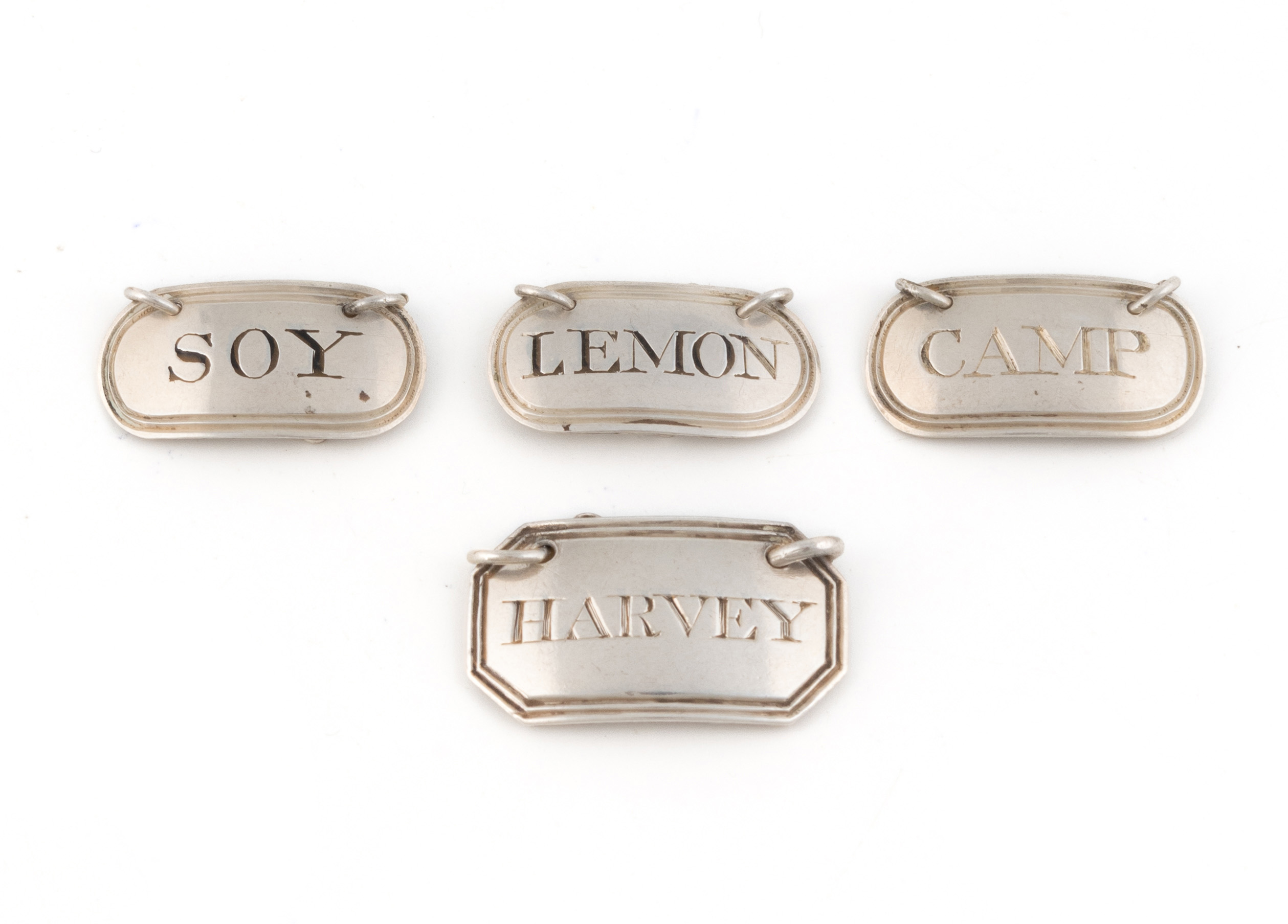 oblong form with reeded border, incised 'Soy', 'Lemon' and 'Camp', plus a George IV Irish silver sauce label by Henry Flavelle, Dublin circa 1825, retailed by Law, incised 'Harvey', length 2.8cm, total approx. weight 0.3oz. (4)