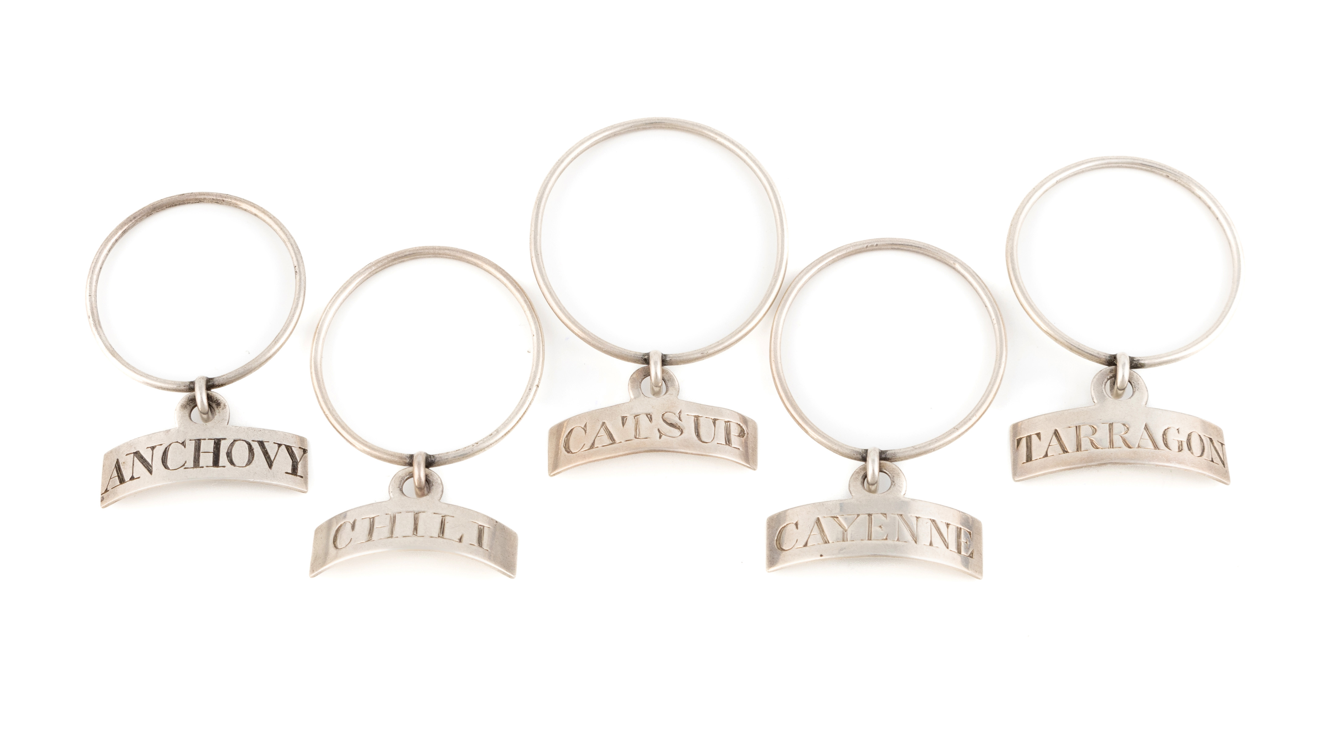 rectangular forms, incised 'Catsup', 'Cayenne', 'Chili', 'Anchovy' and 'Tarragon', length 3.1cm, approx. weight 0.9oz. (5)
