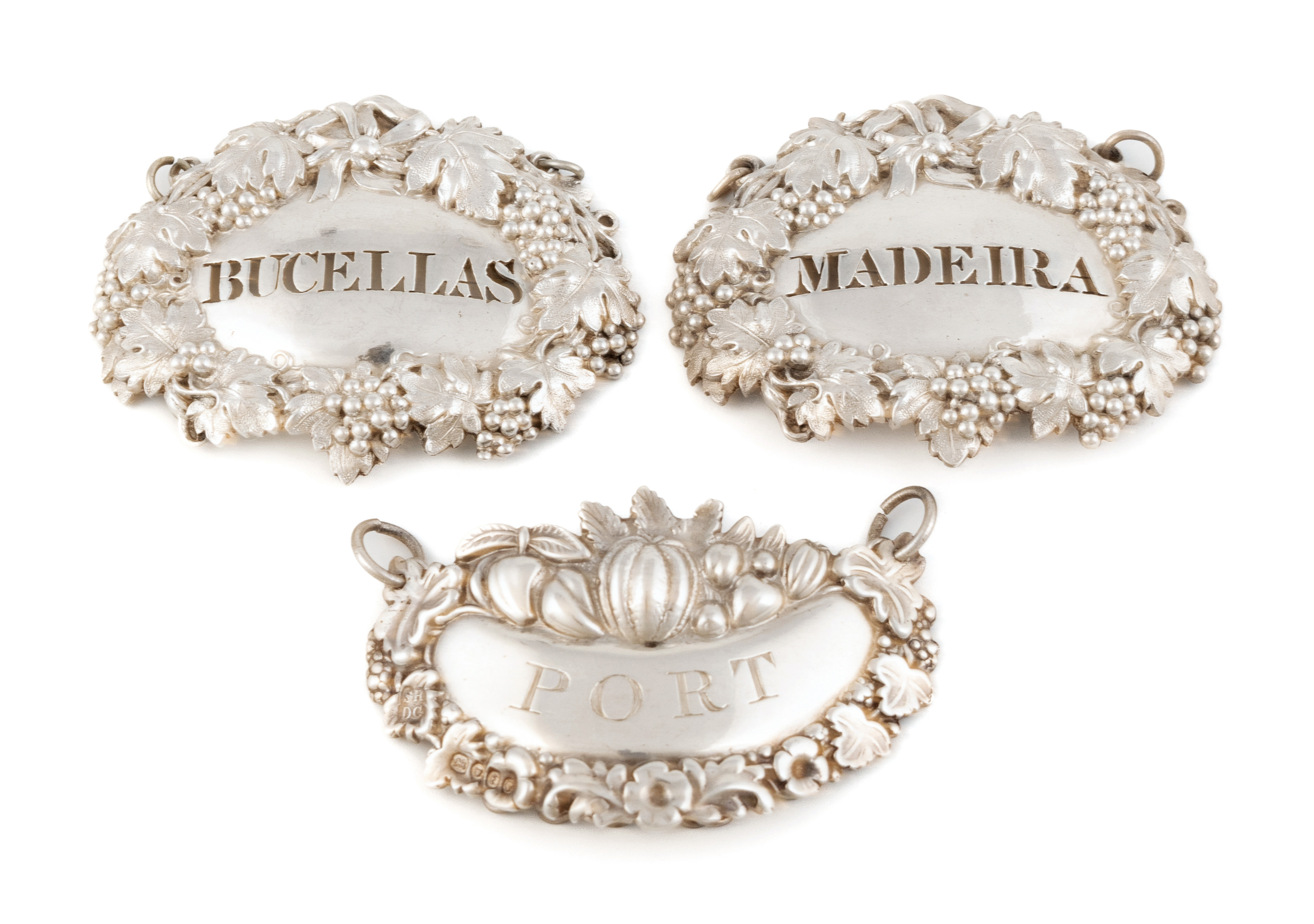 shaped oval form with embossed grape and vine border, pierced 'Madeira' and 'Bucellas', length 6.3cm, plus a Victorian silver wine label by Hayne & Cater, London 1861, incised 'Port', total approx. weight 1.8oz. (3)