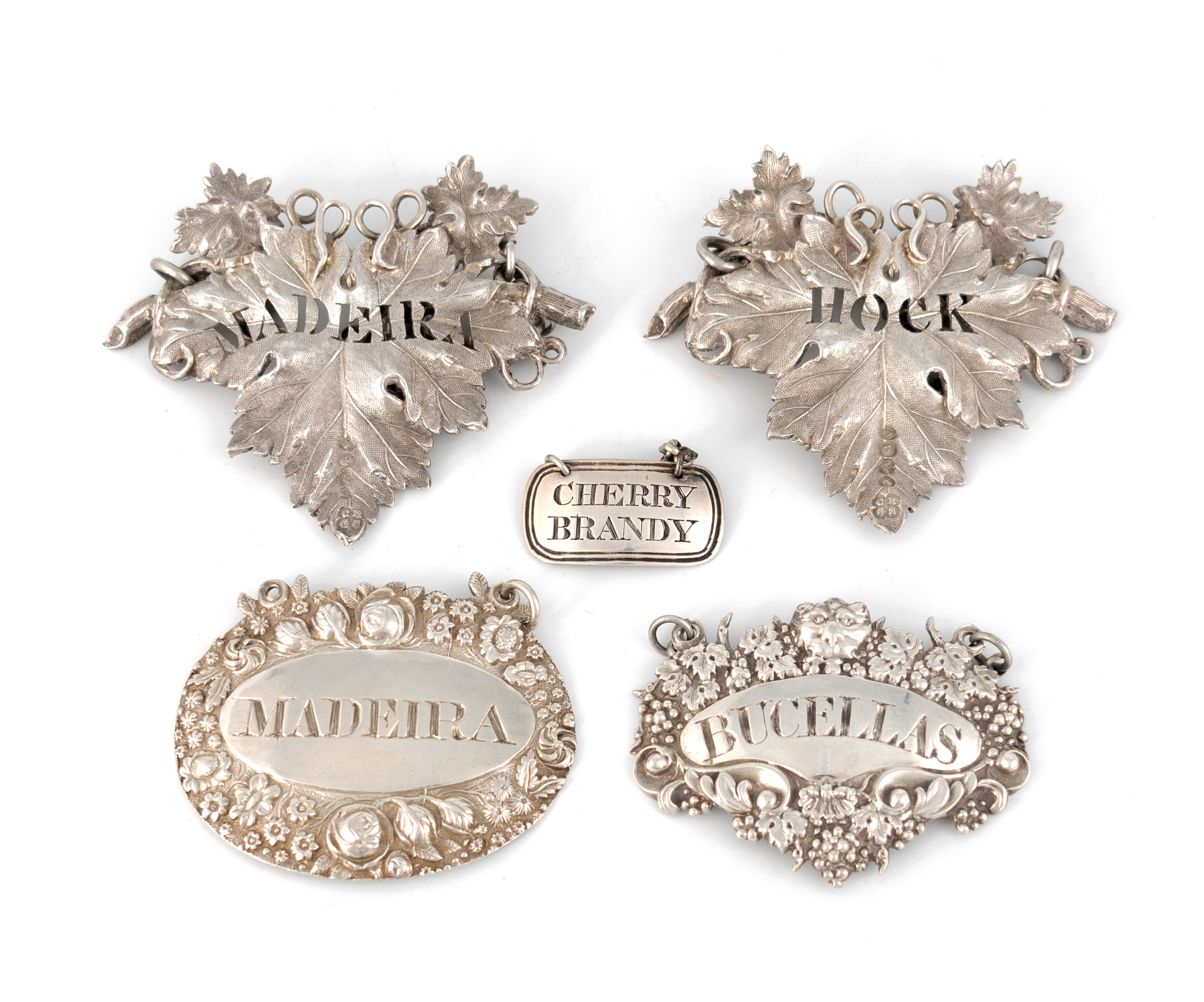 comprising: a pair by Charles Reily & George Storer, London 1837, vine leaf form, pierced 'Hock' and 'Madeira', length 7cm, one by Charles Rawlings & William Summers, London 1830, incised 'Bucellas', one by Thomas Wallis & Jonathan Hayne, London 1818, incised 'Madeira', and one by Charles Reily & George Storer, London circa 1830, incised 'Cherry Brandy', total approx. weight 2.8oz. (5)