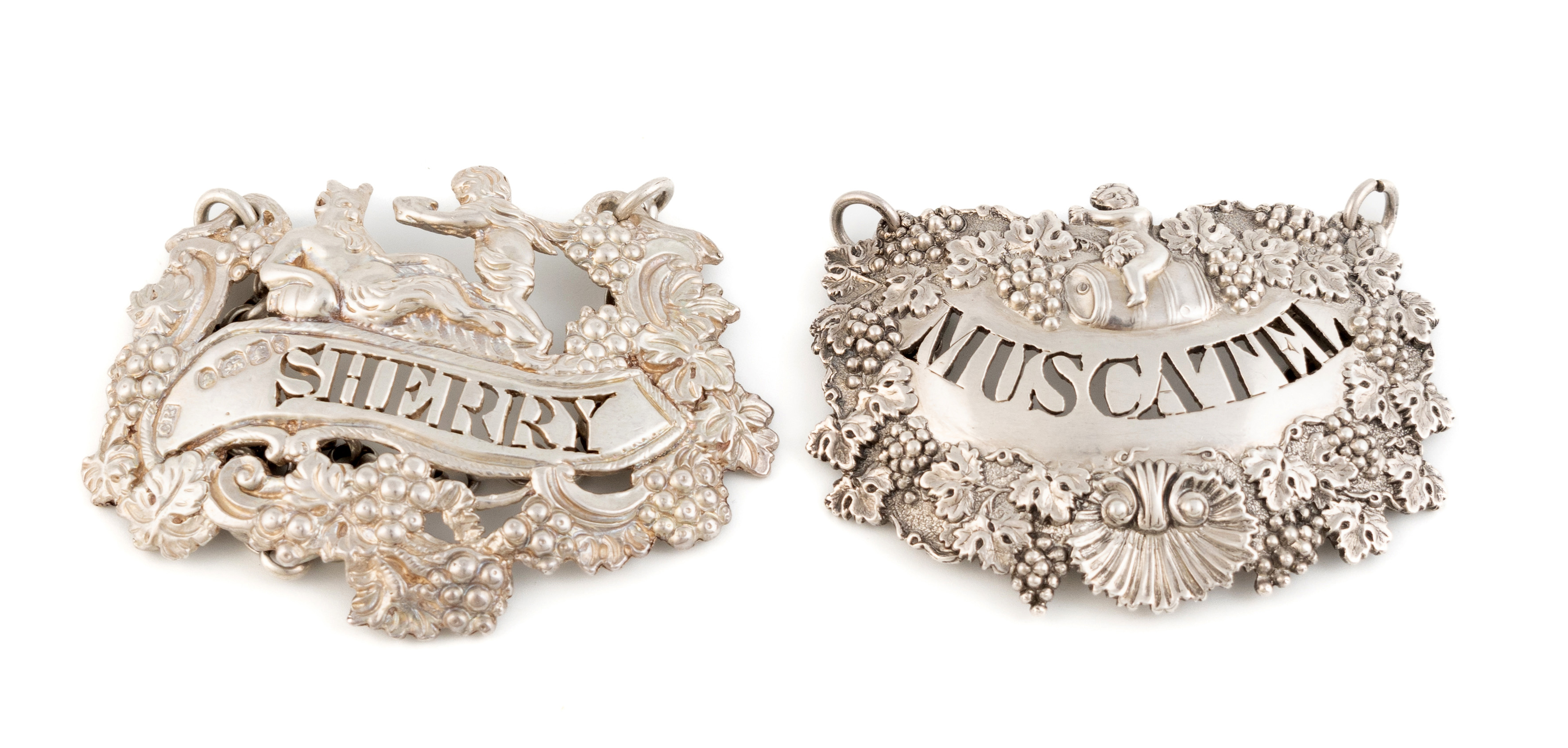 shaped form, with a cherub handing a wine cup to a reclining Bacchanalian figure, pierced 'Sherry', length 6.1cm, plus a label by William Bateman, London circa 1820, pierced 'Muscatel', total approx. weight 1.5oz. (2)