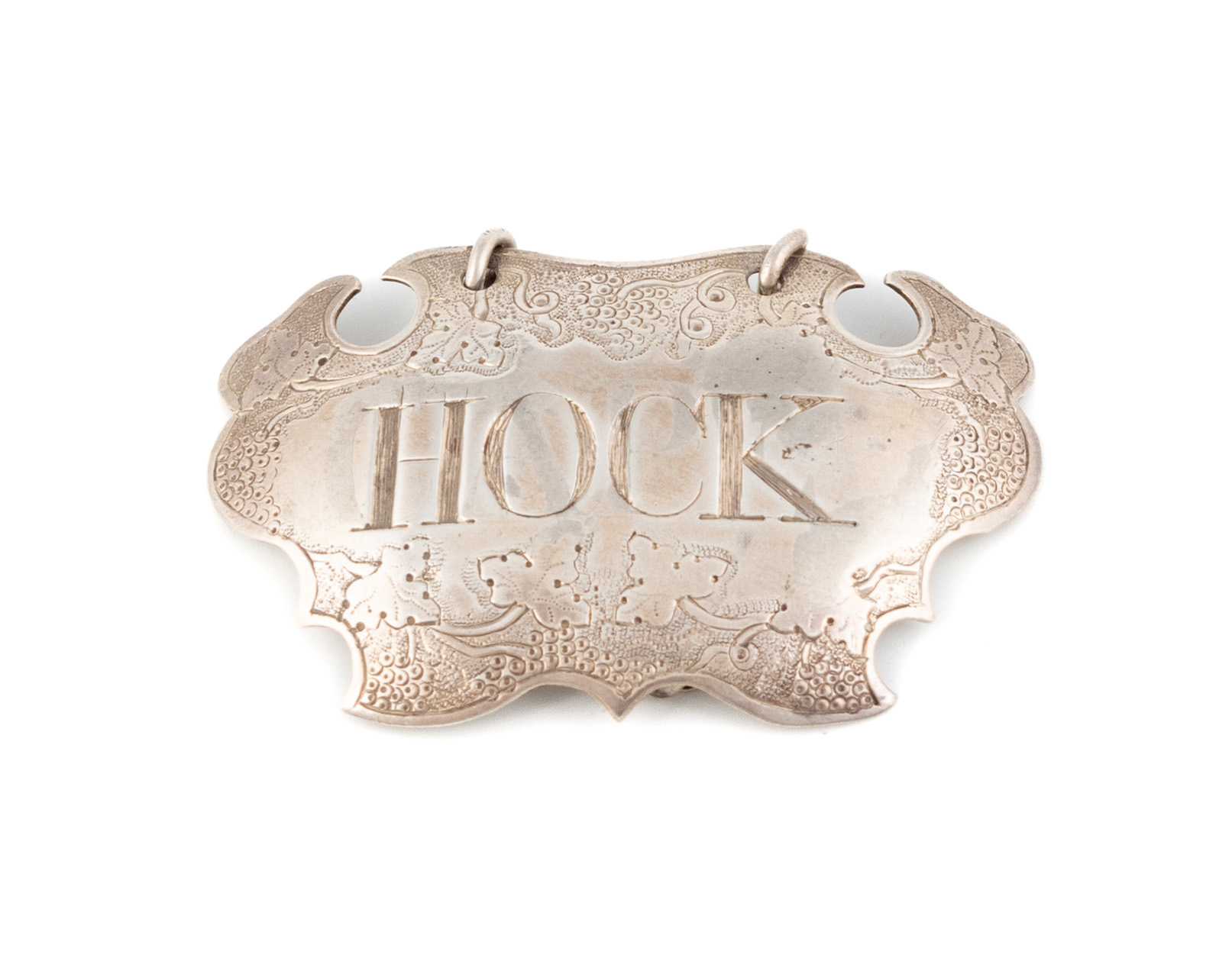 escutcheon form, with grape and vine decoration, incised 'Hock', length 5.5cm approx. weight 0.3oz.