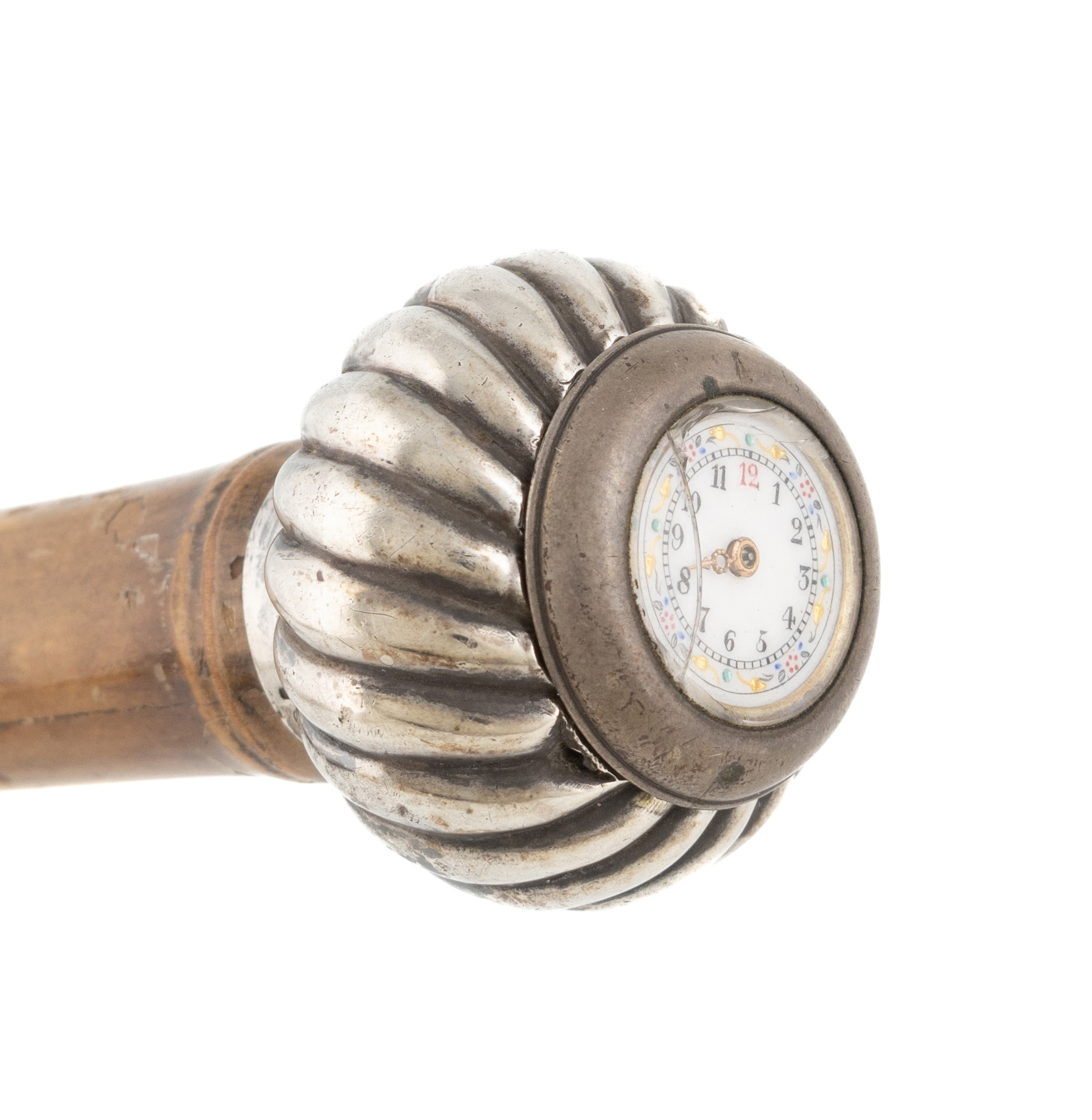 bamboo shaft, the fluted ball handle set with a watch under glass, enamelled face, lacking a hand and crack to glass, length 94cm.