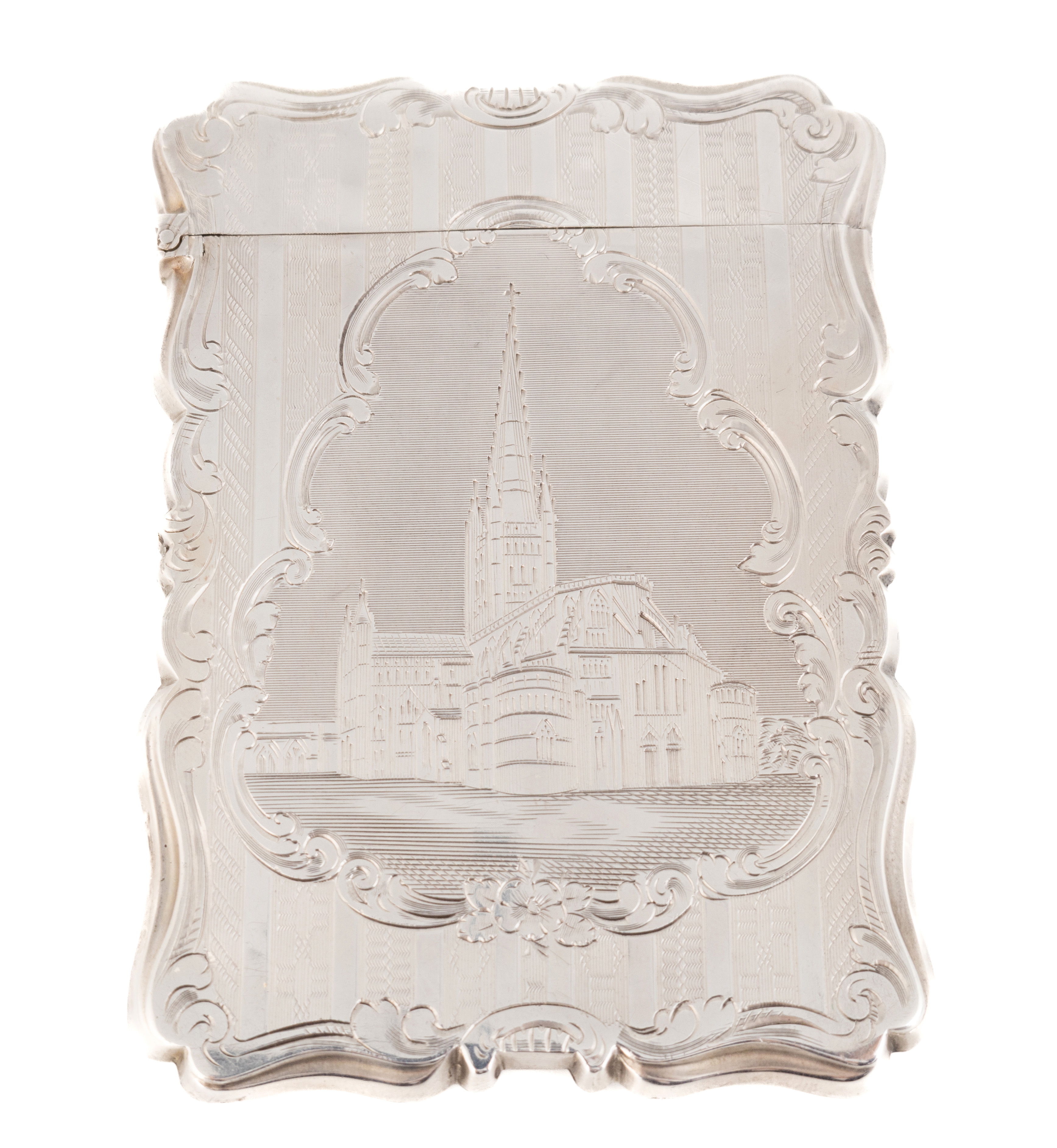 A Victorian silver engraved 'castle-top' card case, Norwich Cathedral,