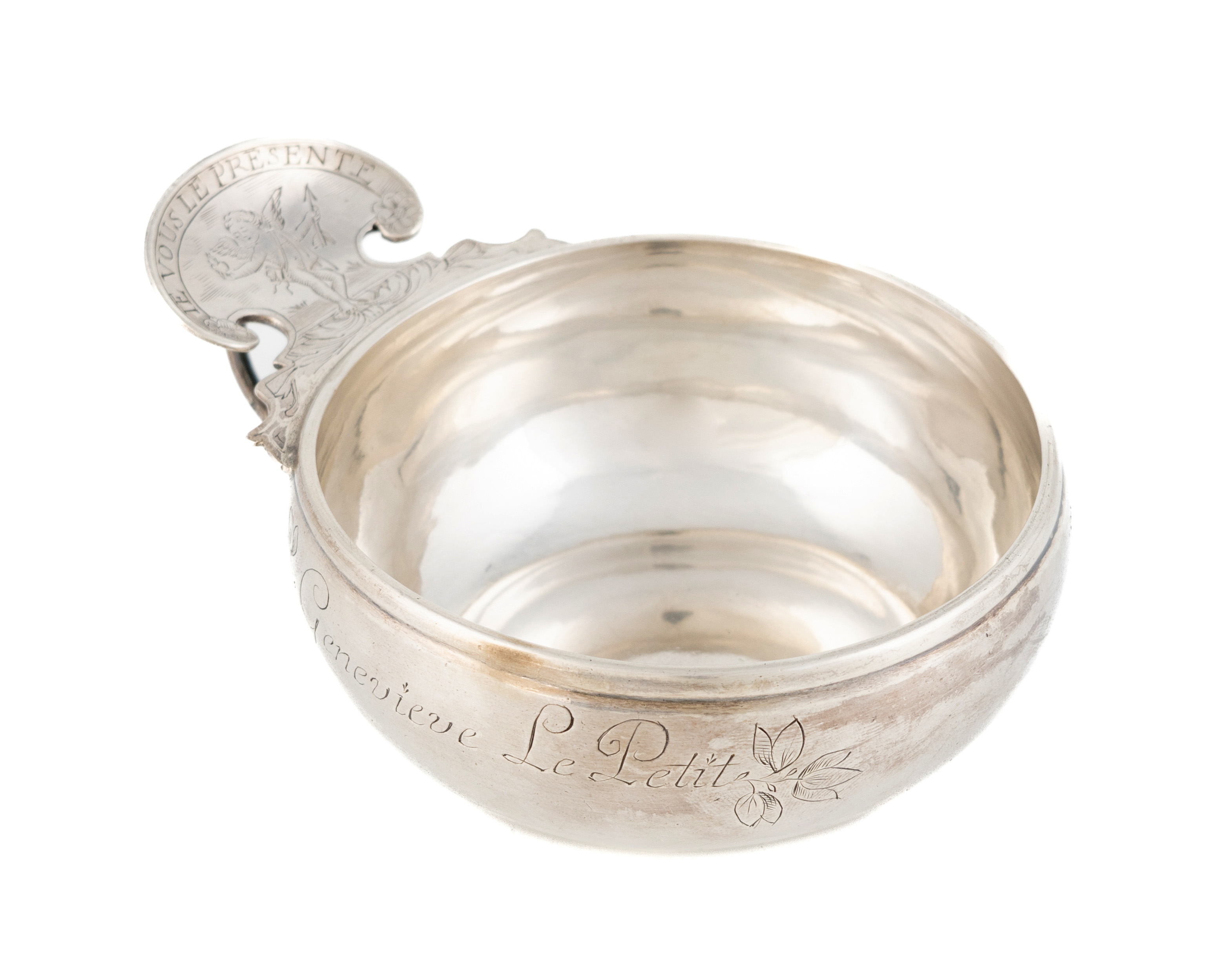 circular form, the shaped scroll thumb-piece engraved with a cherub holding an arrow and a flaming heart, also inscribed 'Me Genevieve Le Petit', with a finger ring, the side inscribed 'M. Anne Bouard', length 11.5cm, approx. weight 3.8oz.