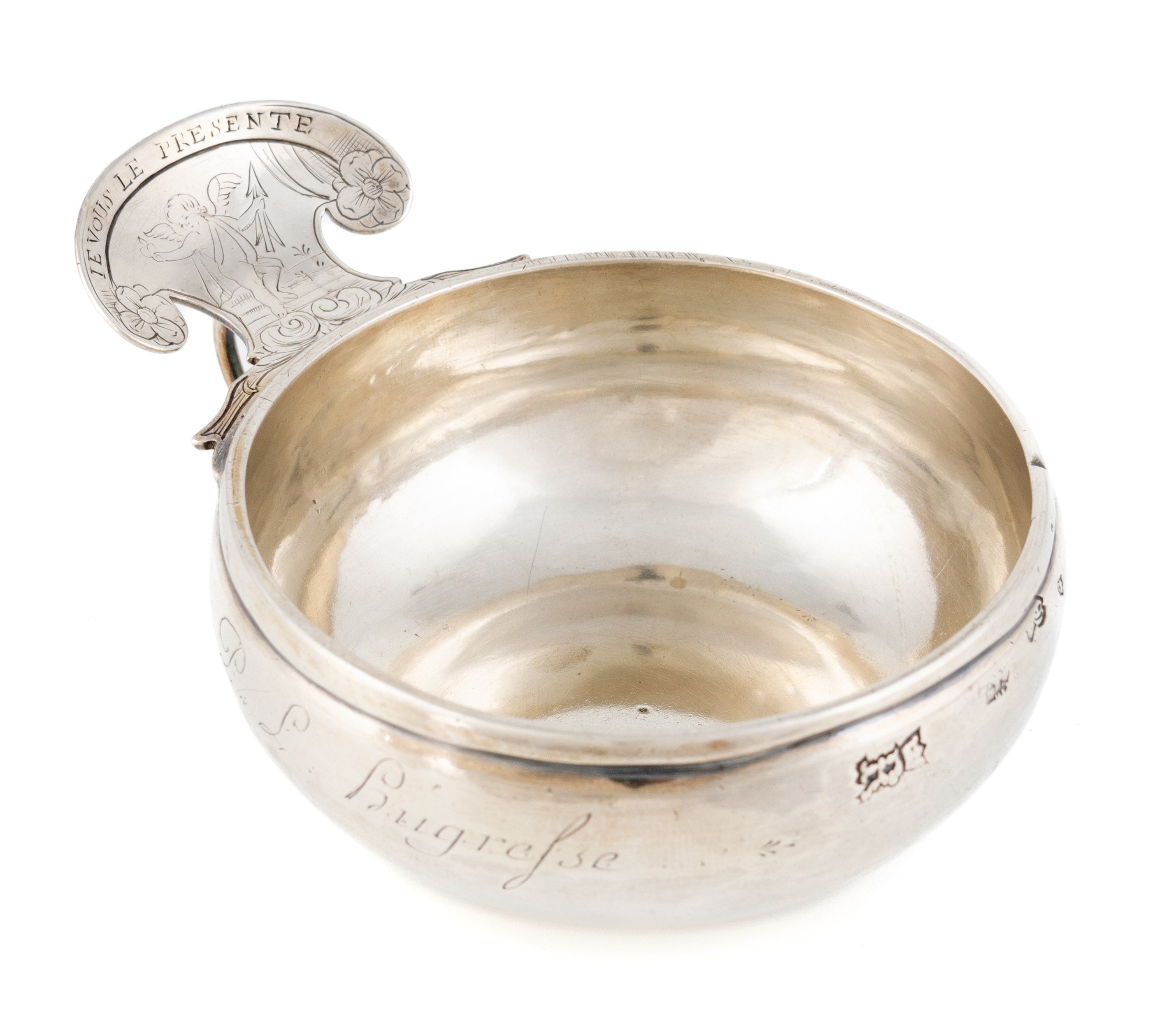 circular form, the shaped scroll thumb-piece engraved with a cherub holding an arrow and a flaming heart, 'Ie Vous Le Presente', with a finger ring, the side inscribed 'P.L Hugresse', length 11.6cm, approx. weight 3.6oz.