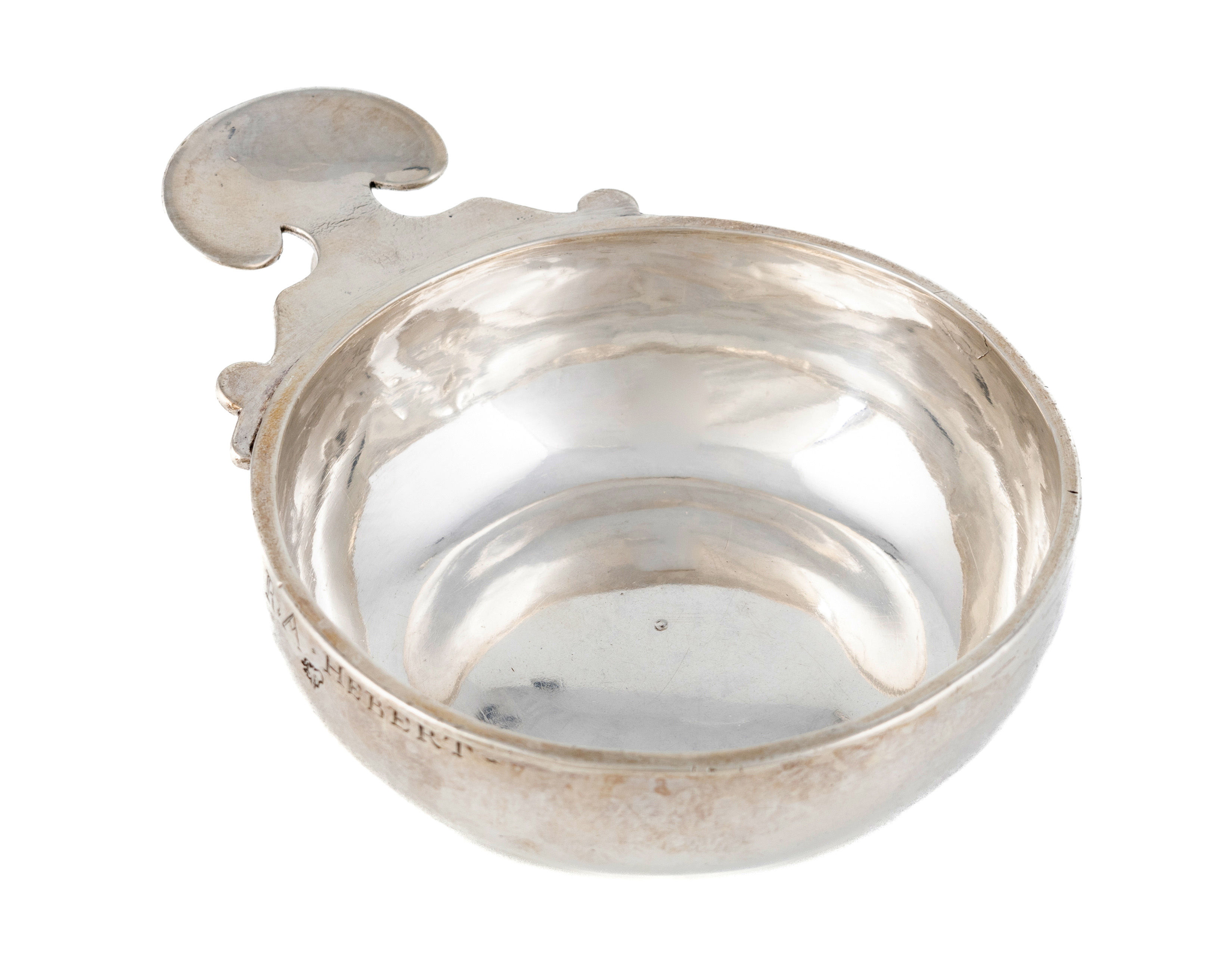 circular form, plain shaped scroll thumb-piece, with a finger ring, the side inscribed 'R.A. Herbert', length 13cm, approx. weight 5oz.