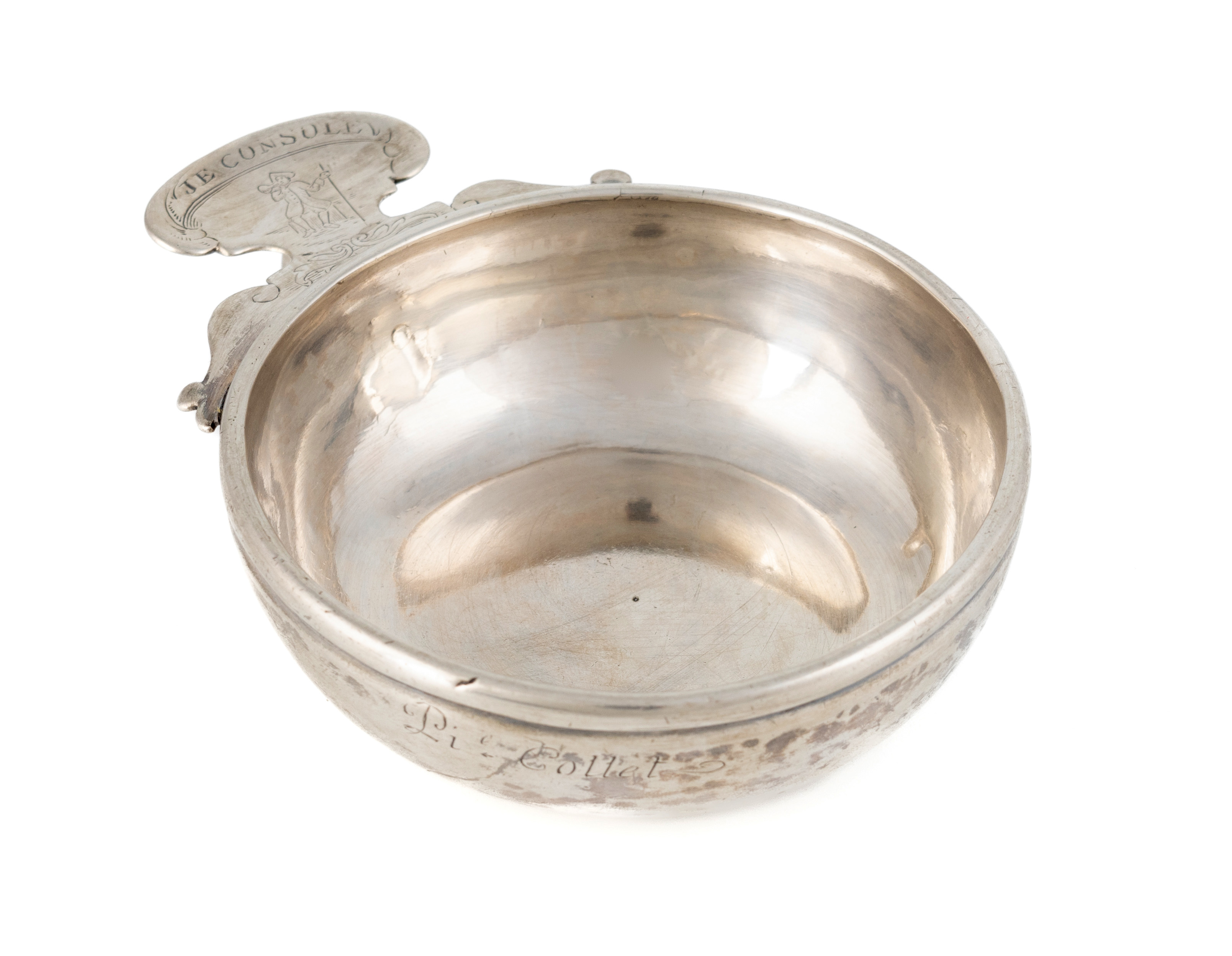 circular form, the shaped scroll thumb-piece engraved with a resting man drinking wine, and inscribed 'Je Consoll', with a finger ring, the side inscribed 'Pi Collet', length 12cm, approx. weight 3.9oz.