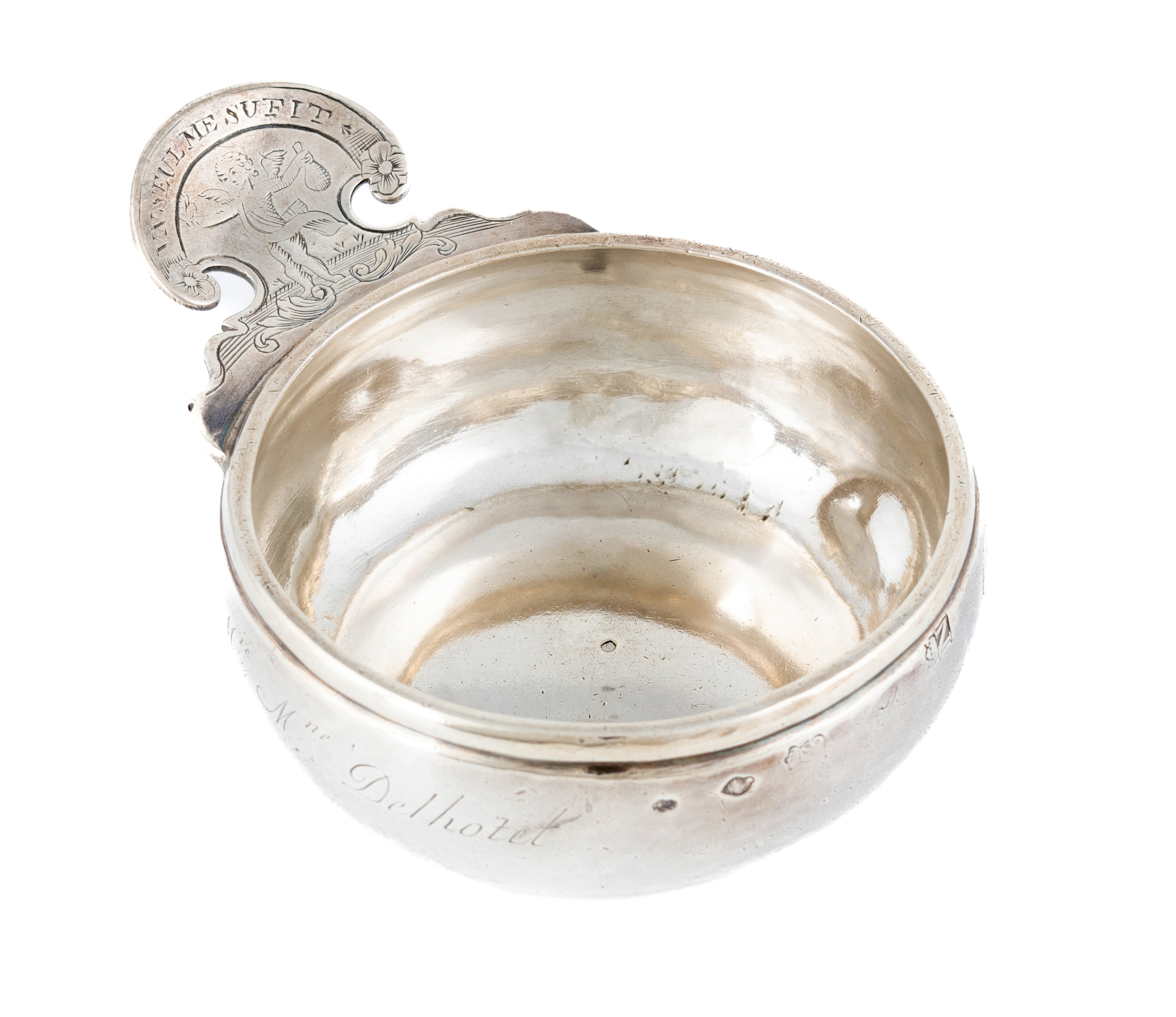 circular form, the shaped scroll thumb-piece engraved with a cherub holding a bottle of wine, inscribed 'Un Seul Me Sufit', with a finger ring, the side inscribed 'Mie. Mne. Delhotel', length 11.5cm, approx. weight 4.6oz.