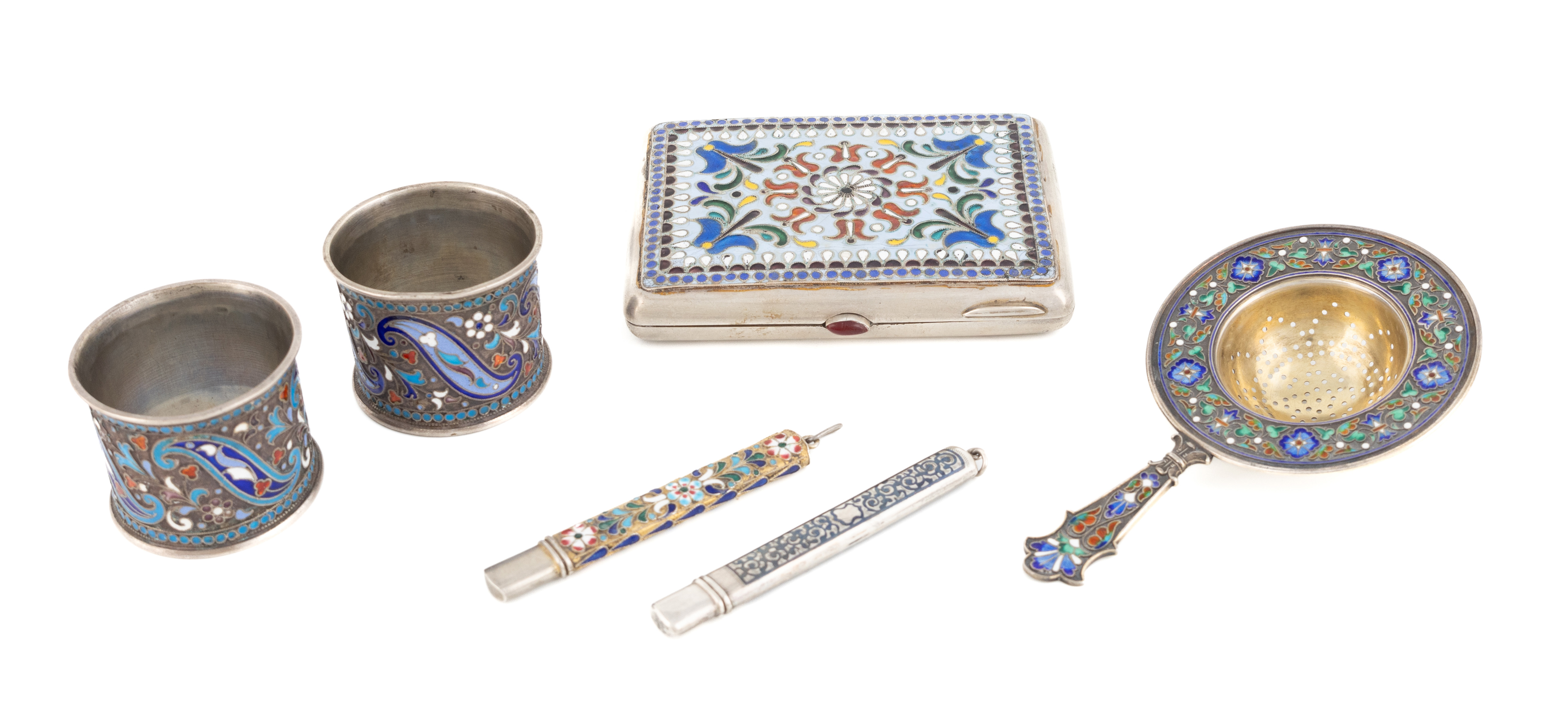 comprising: a late-19th century Russian cigarette case, two napkin rings, two pencils and a Norwegian strainer, total approx. weight 9.2oz. (6)