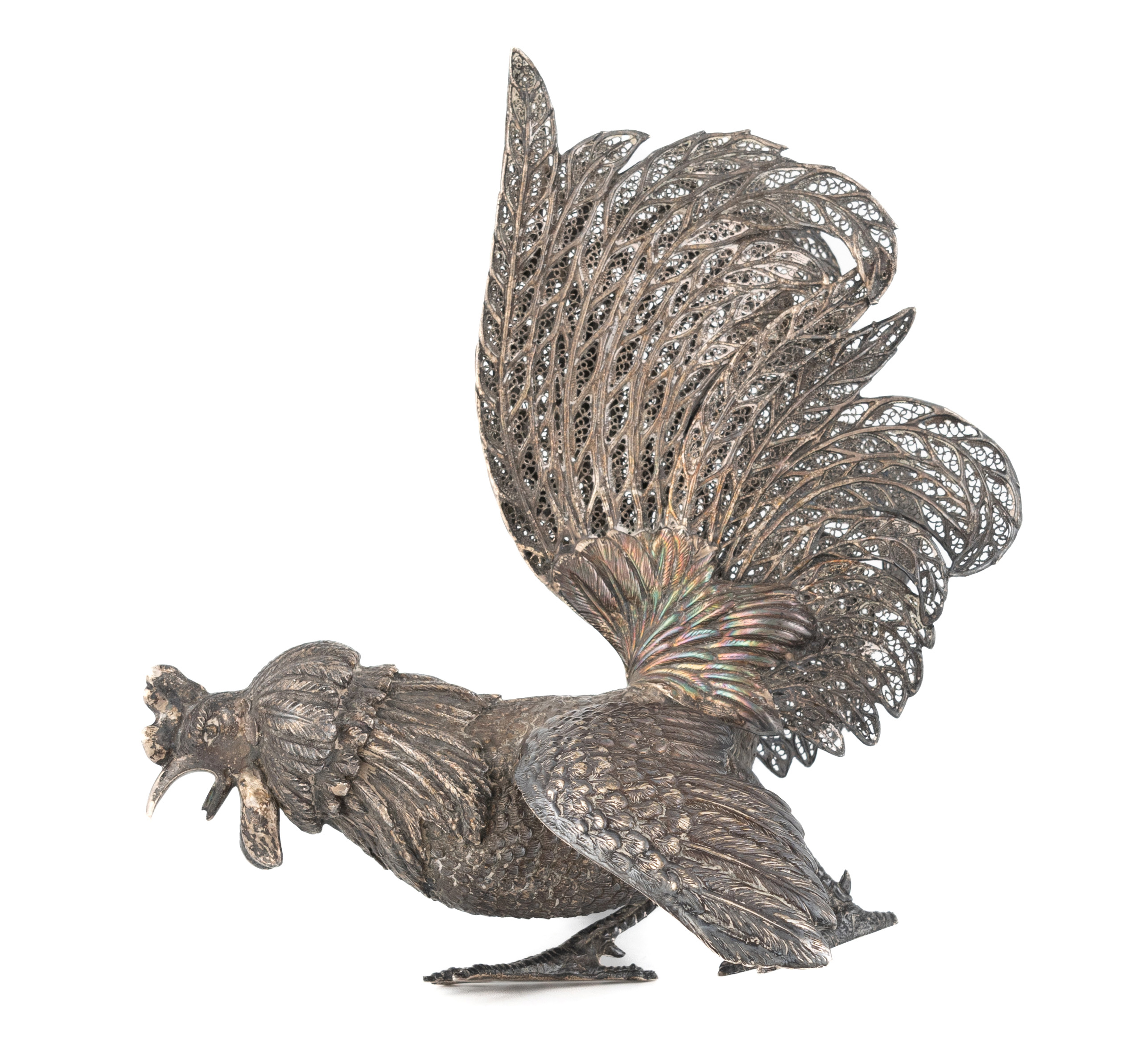 modelled in a fighting position, with textured and filigree feather decoration, height 20.8cm, approx. weight 14.1oz.