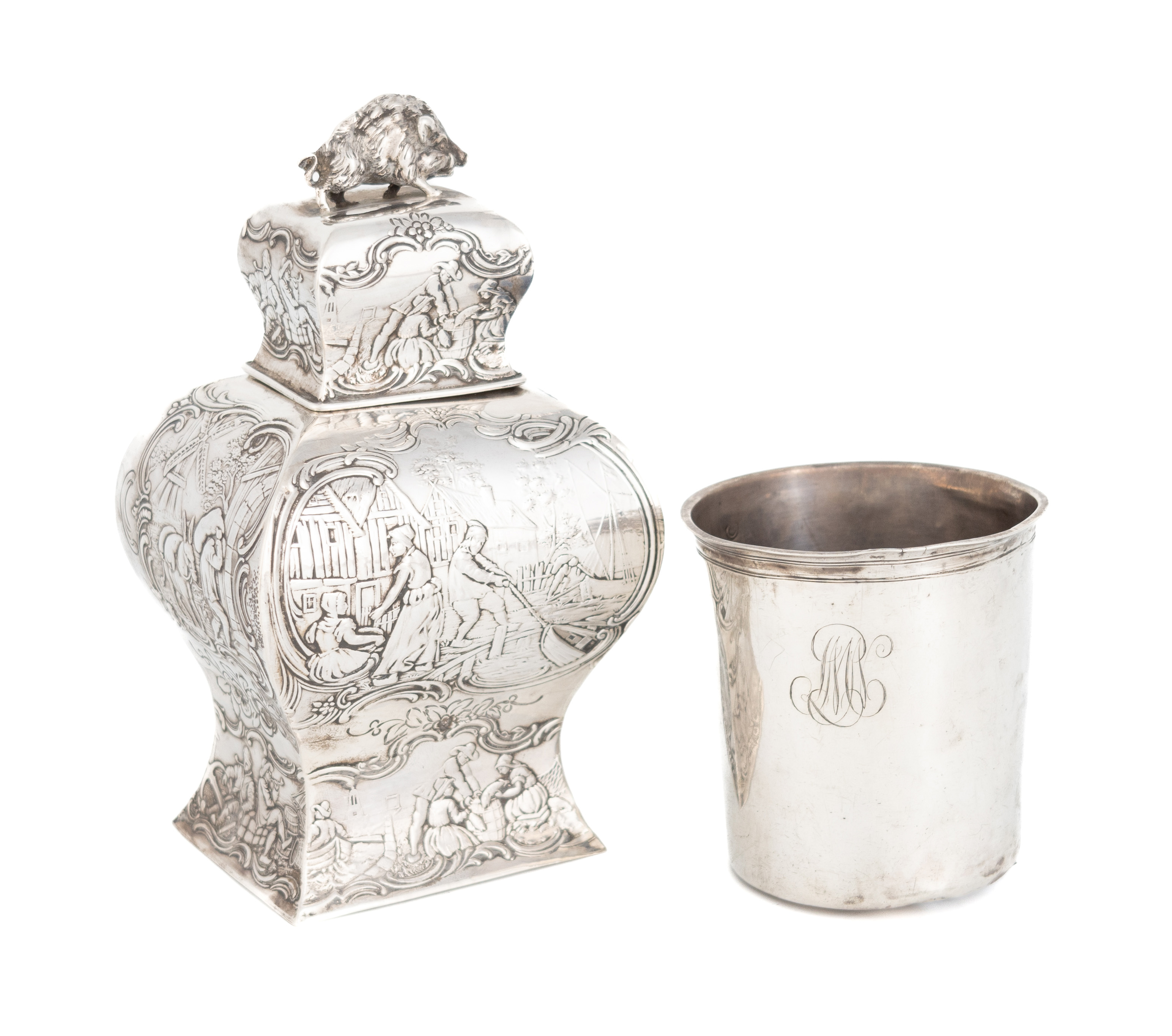 rectangular bombé form, chased figural and scroll decoration, the pull-off cover with a wild boar finial, height 15cm, plus a late-18th century French silver beaker, of tapering circular form, height 7.5cm, approx. weight 8.5oz. (2)