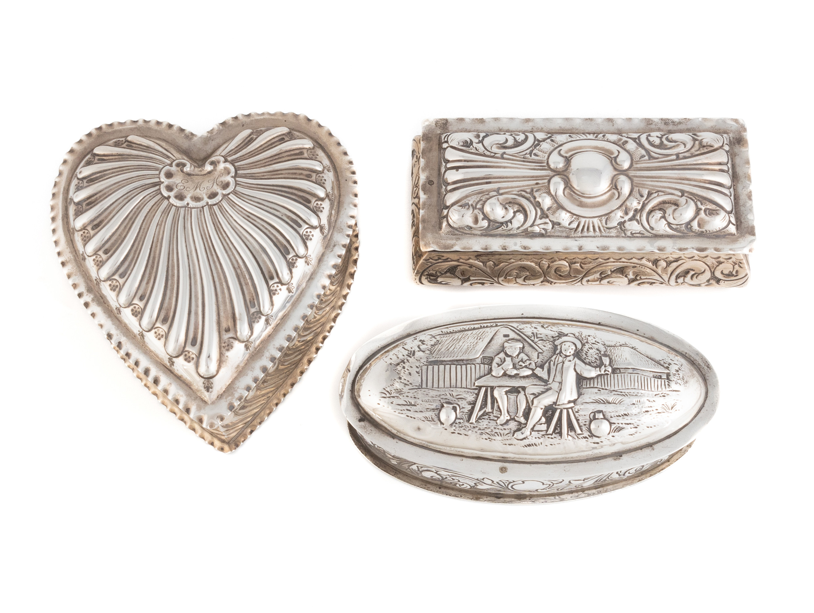 one of heart-shaped form with fluted decoration and engraved initials, the other of oval form with an embossed tavern scene to the cover, plus one by A & J Zimmerman Ltd, Birmingham 1897, rectangular form with embossed scroll foliate decoration, length 12.8cm, total approx. weight 18.6oz. (3)