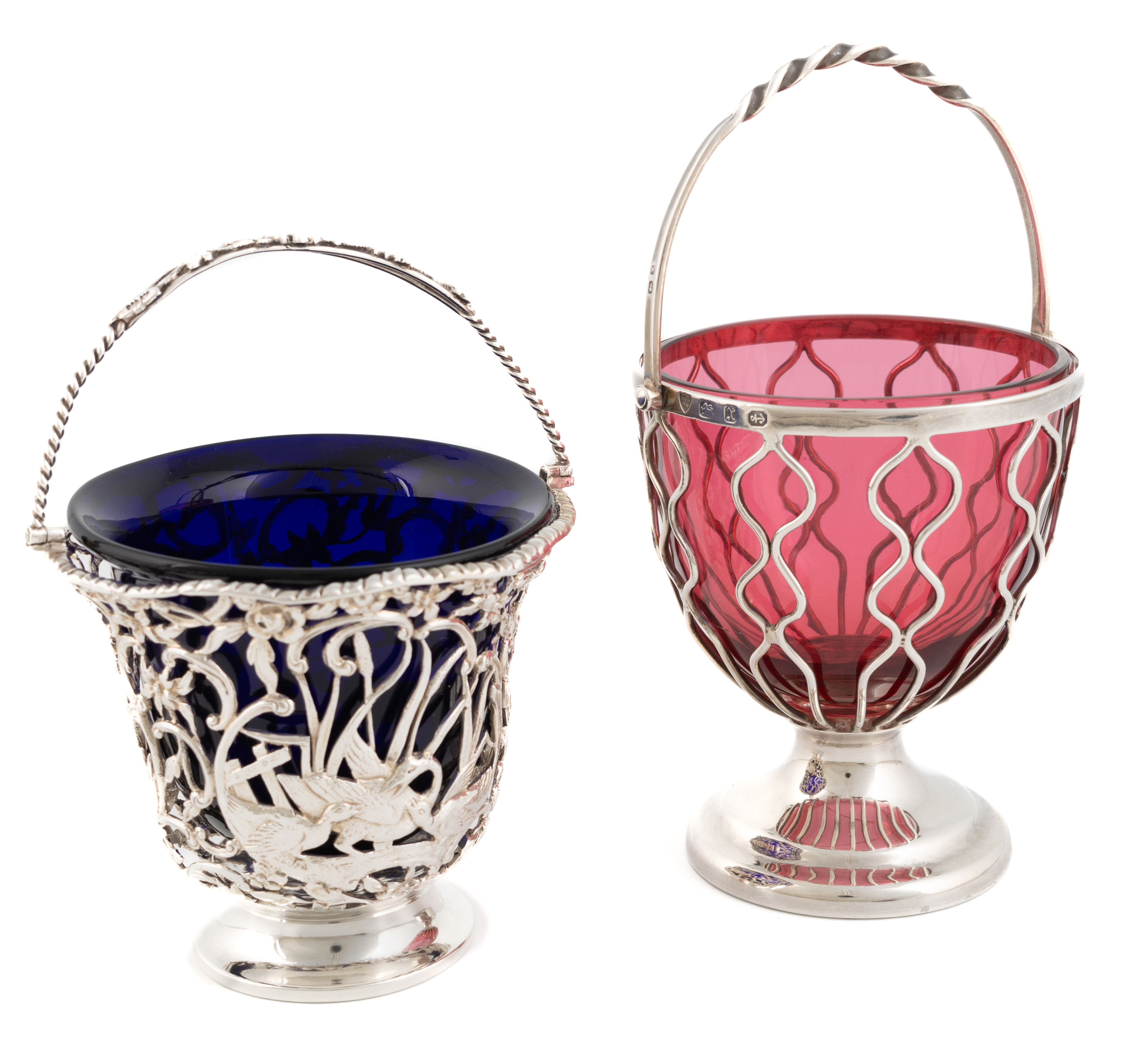 circular form, pierced with animals and scroll decoration, with a blue glass liner, plus a late-Victorian swing-handled sugar basket, Birmingham 1897, with a red glass liner, approx. weighable 5.5oz. (2)