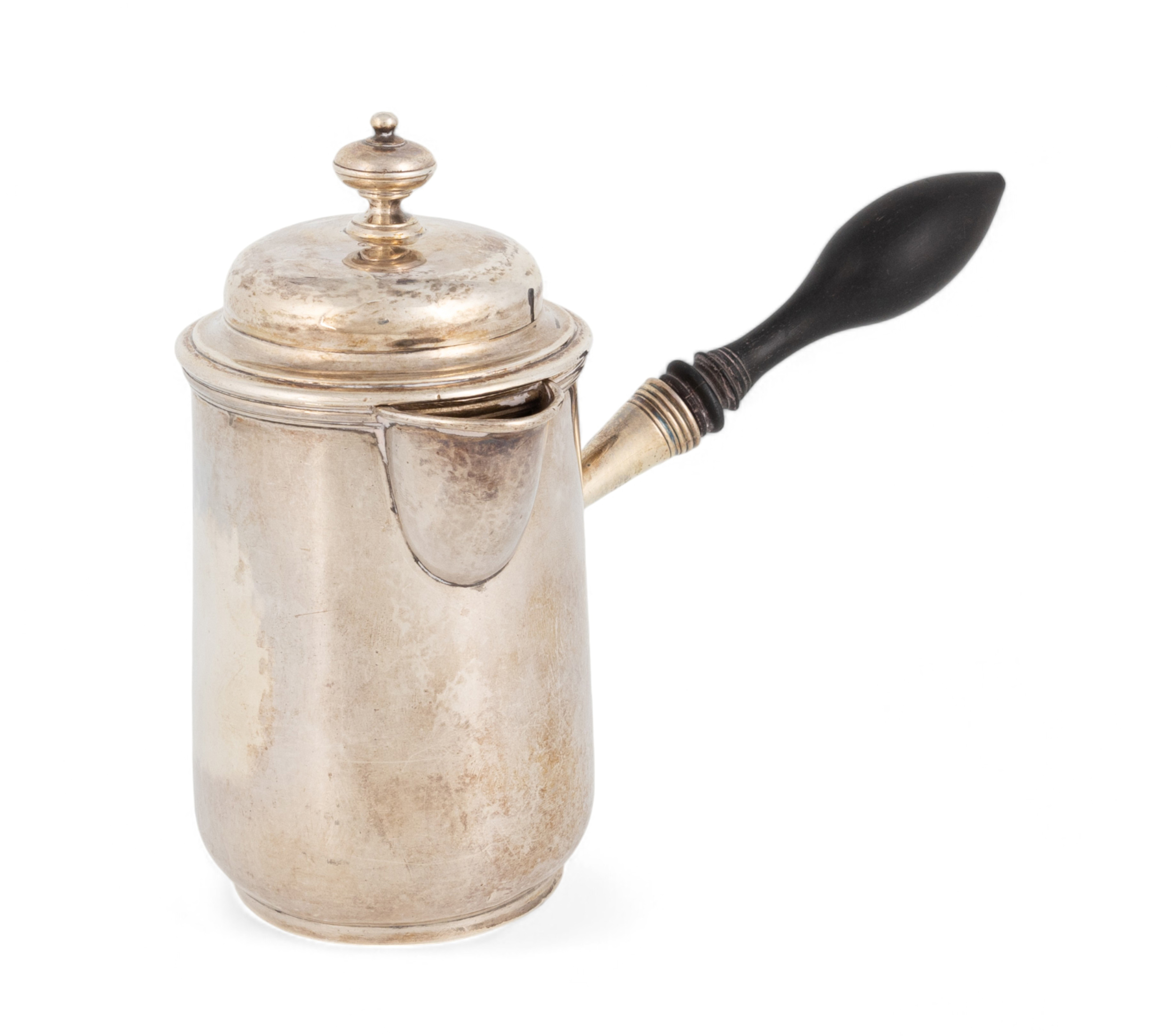 tapering circular form, turned wooden baluster handle, the domed cover with a knop finial, height 15.3cm, approx. weight 10.9oz.
