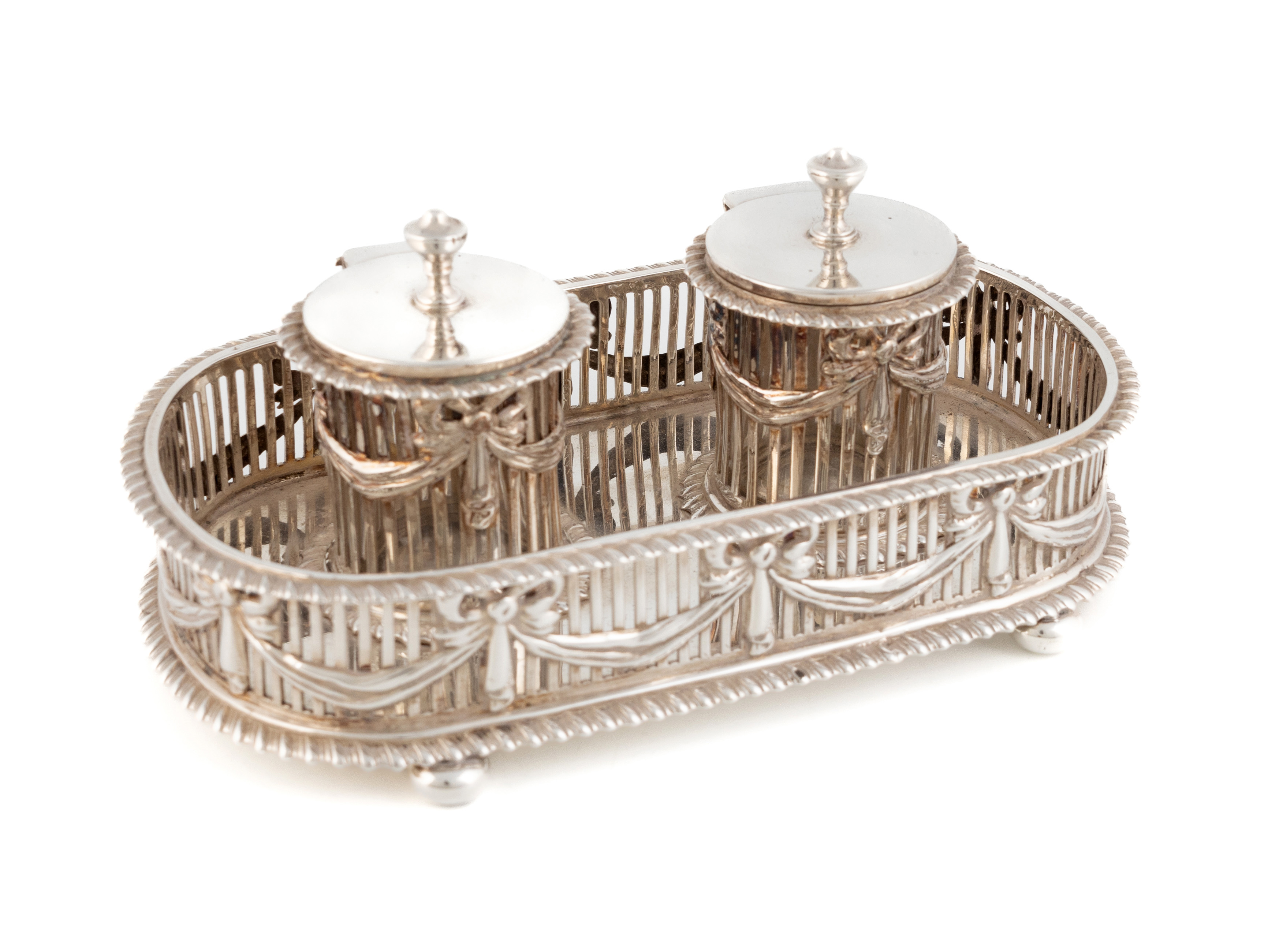 oblong form, pierced gallery, with two inkwells with hinged covers, on four bun feet, length 14.4cm, approx. weight 8.6oz.