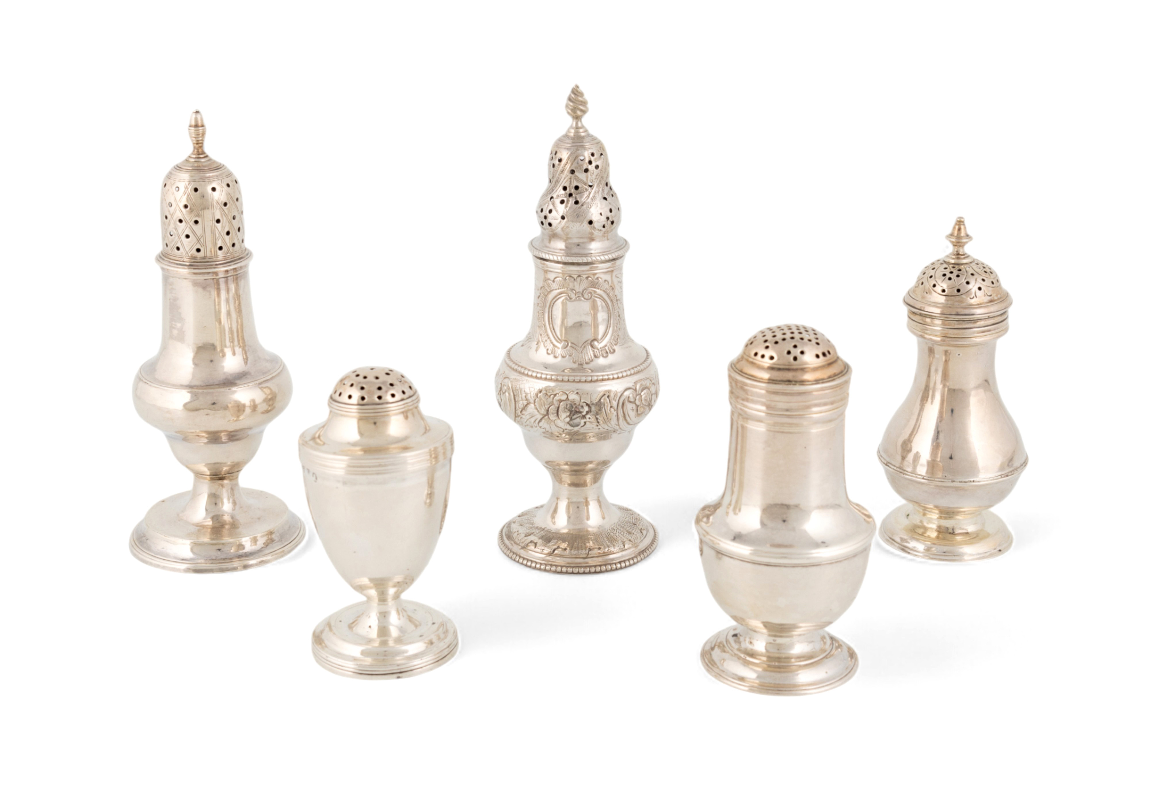 comprising: one by Thomas Daniell, London circa 1780, with later embossed decoration, one by Samuel Wood, London 1747, one with no apparent maker's mark, London 1756, one possibly by Solomon Hougham, London 1793, and one with a worn maker's mark W?, London 1799, total approx. weight 12.3oz. (5)