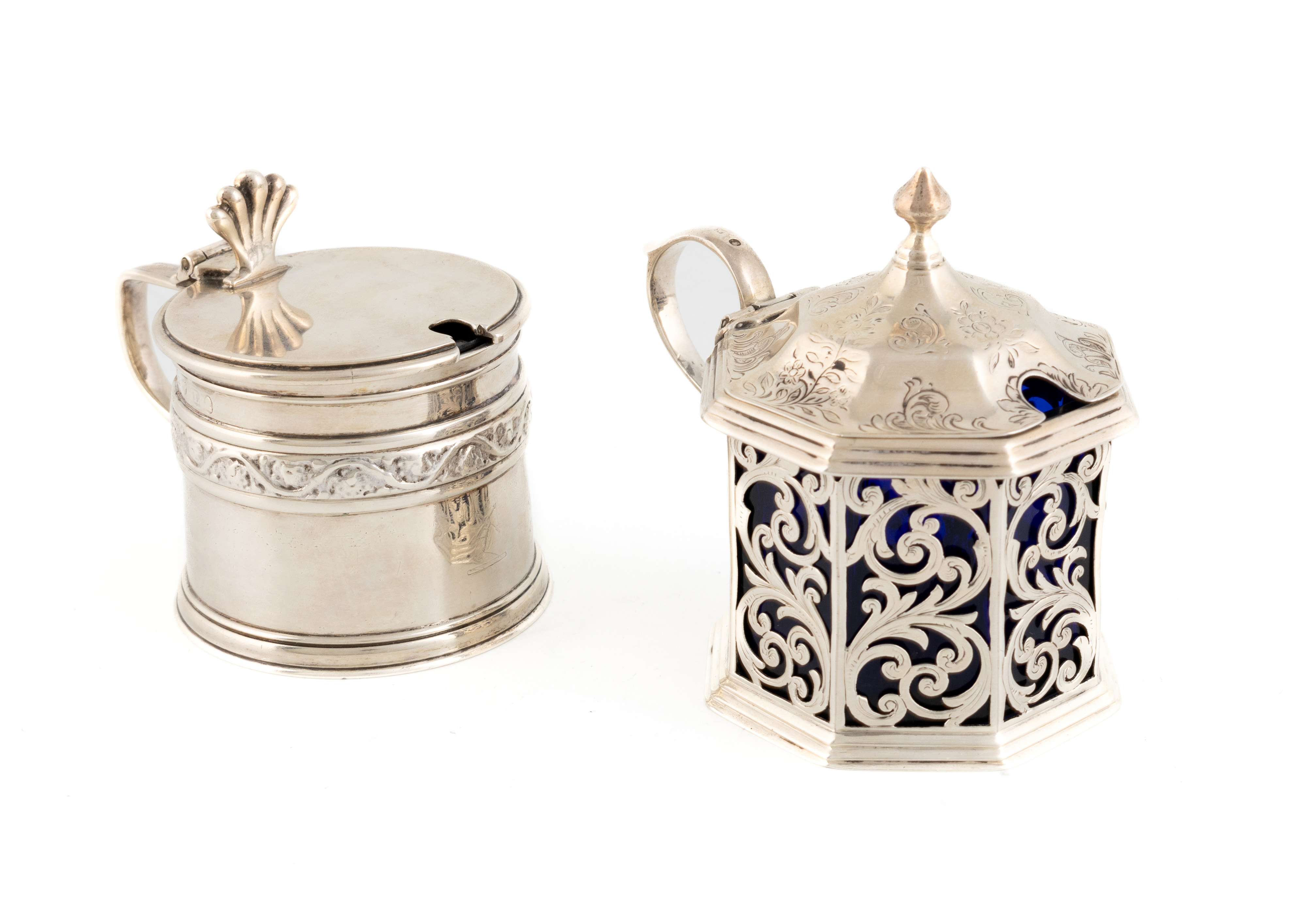 plain circular form with a band of scroll foliate decoration, and shell thumbpiece, plus a Victorian silver mustard pot by Yapp & Woodward, Birmingham 1849, octagonal form with pierced scroll decoration, height 8.3cm, total approx. weight 8.1oz. (2)
