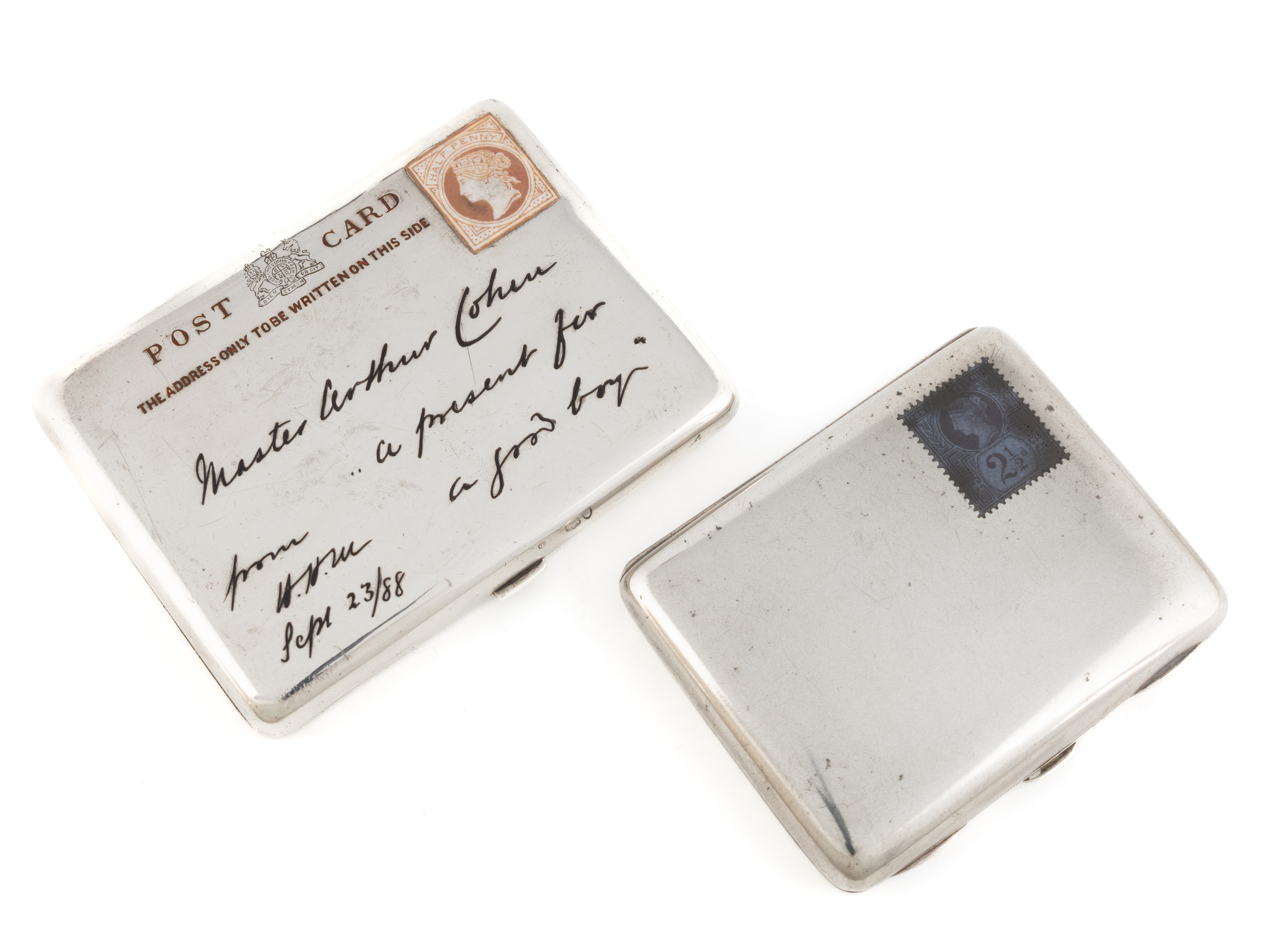 rectangular form, the cover with an enamelled stamp and inscription 'Master Arthur Cohen a present for a good boy from H.H.W Sept 23/88', length 10.8cm, plus an Austrian silver and enamel cigarette case by Georg Scheid, Vienna, with enamelled stamp and envelope outlines, total approx. weight 9.3oz. (2)