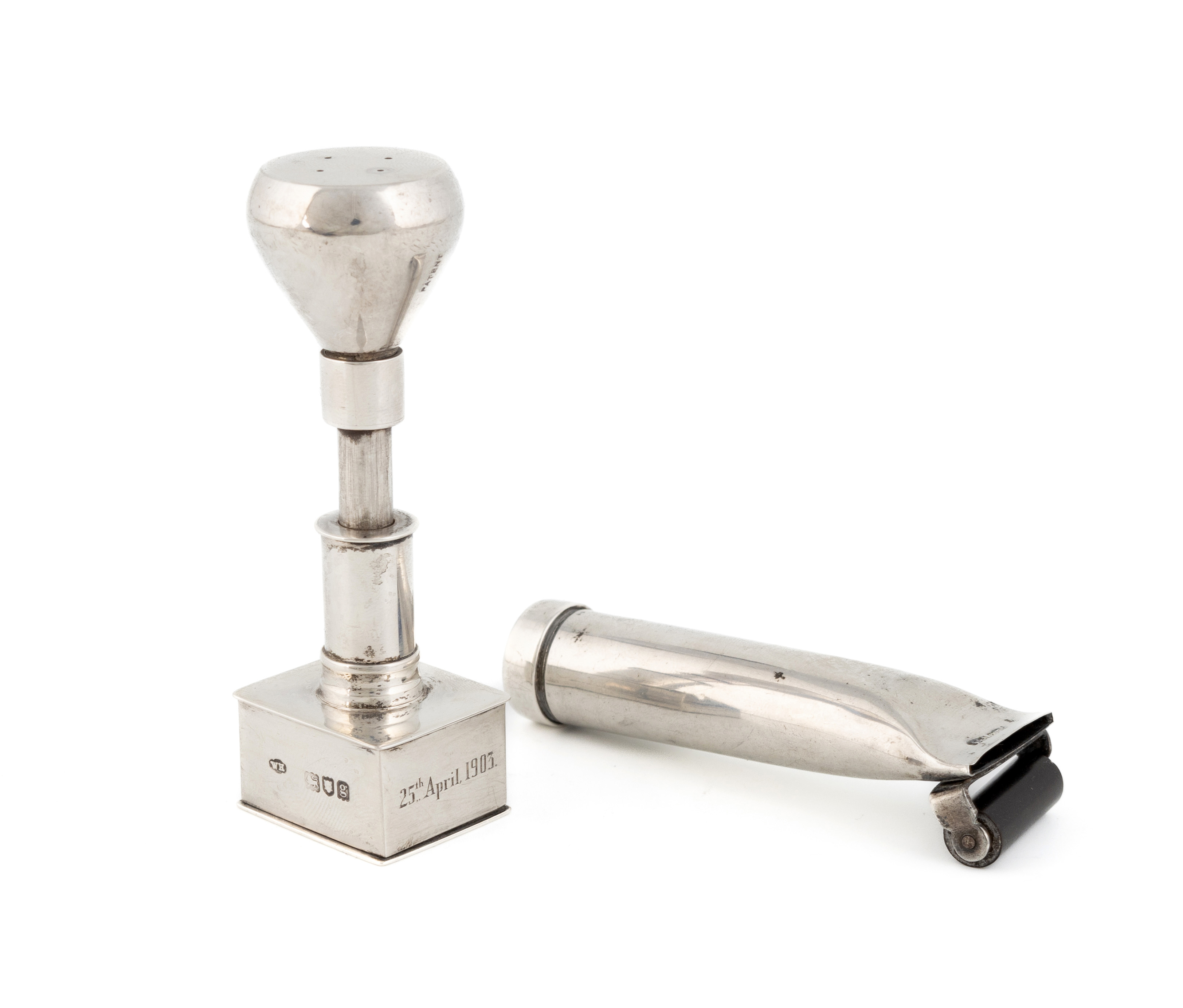a tapering circular form moistener on a cylindrical stem, push-action stamper in the rectangular base, inscribed '25th April 1903', height 8.6cm, plus a silver stamp moistener and roller, by Stuart Clifford & Co, London 1910, in the form of a paint tube with a roller attachment at the end, total approx. weighable 1.6oz. (2)