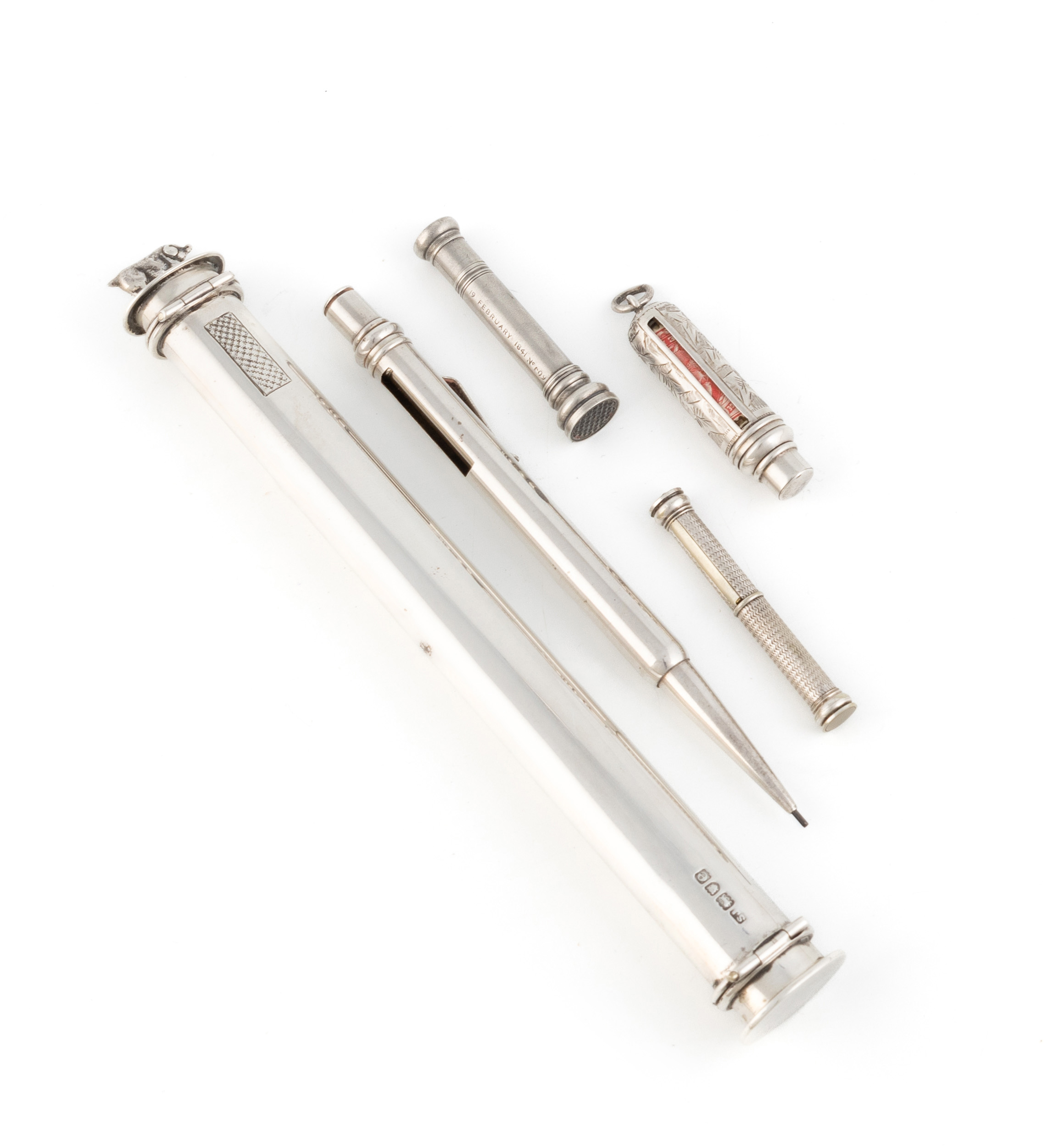 comprising: a late-Victorian sealing wax holder by Samuel Jacob, London 1899, cylindrical form with a pig finial, length 18.8cm, a miniature spring scale, a stamp moistener, a stamp dispenser and a pencil with a stamp dispenser, total approx. weighable 1.9oz. (5)