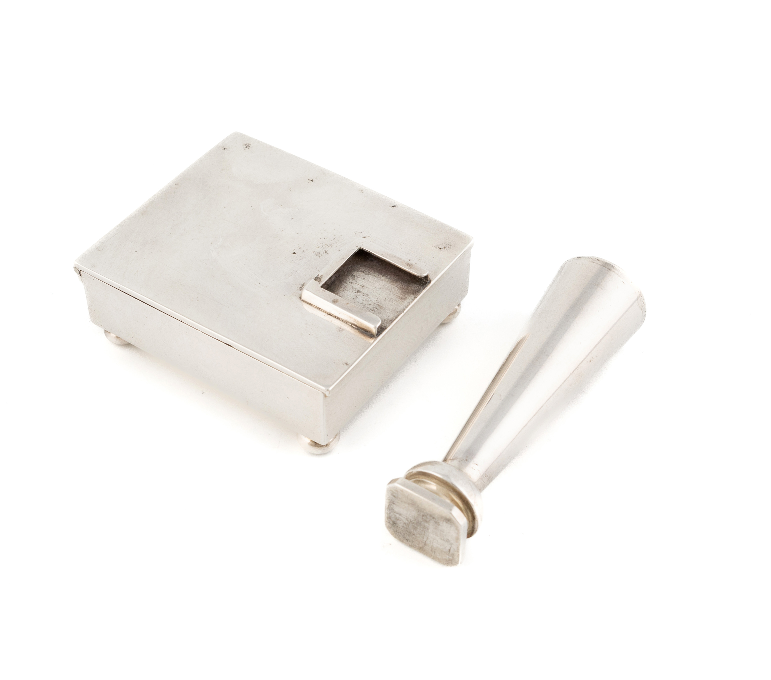rectangular form, with a plain slide-off seal to the cover, on four bun feet, length 6cm, approx. weighable 2.9oz.