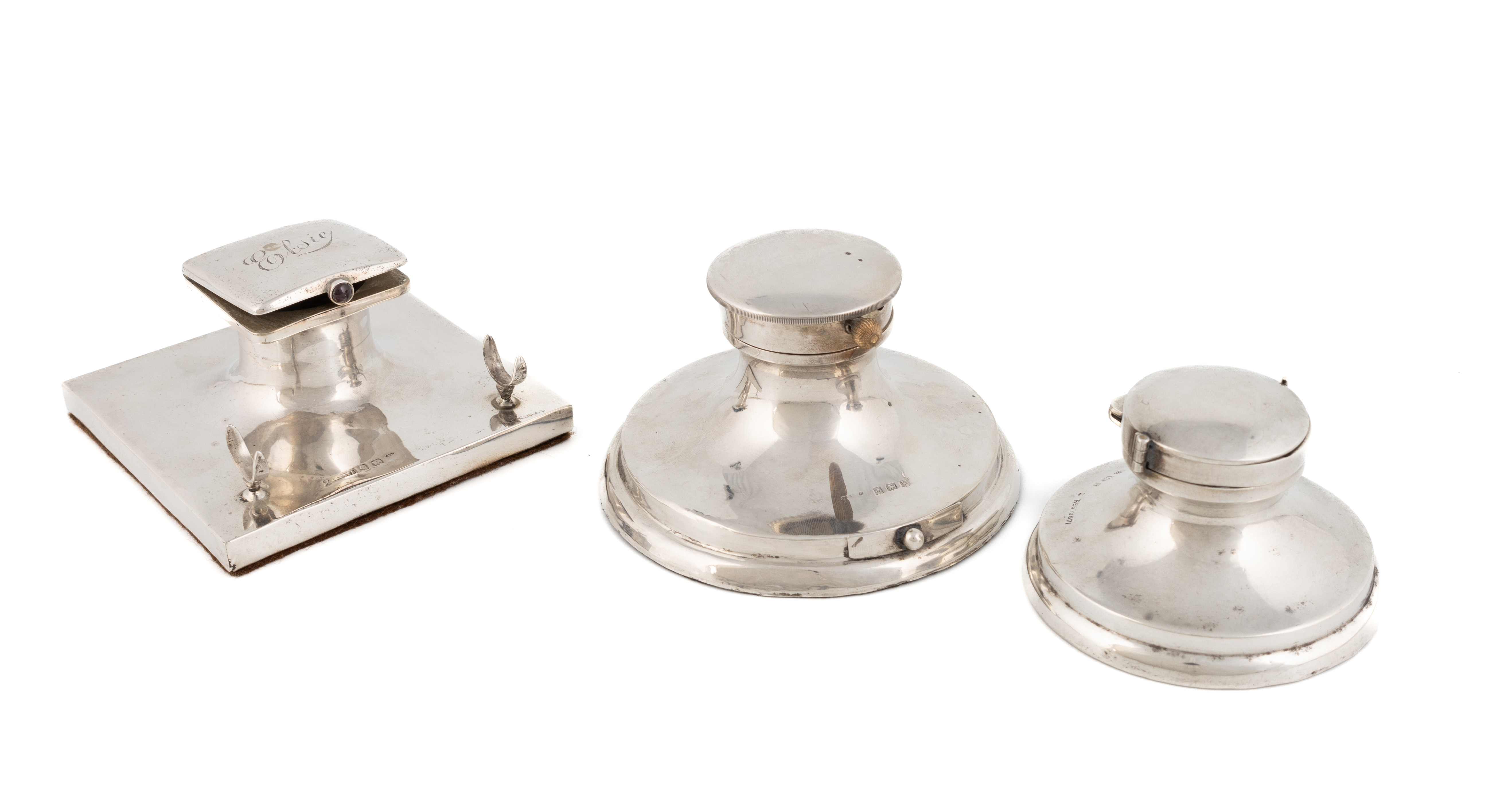 one of plain circular form with a pull-out stamp tray, a clock to the inside of the cover, diameter 9.8cm, one of rectangular form with a pen rest, the hinged cover with a hinged stamp compartment, engraved 'Elsie' to the cover, another of plain circular form, the hinged cover with a hinged sliding stamp compartment. (3)