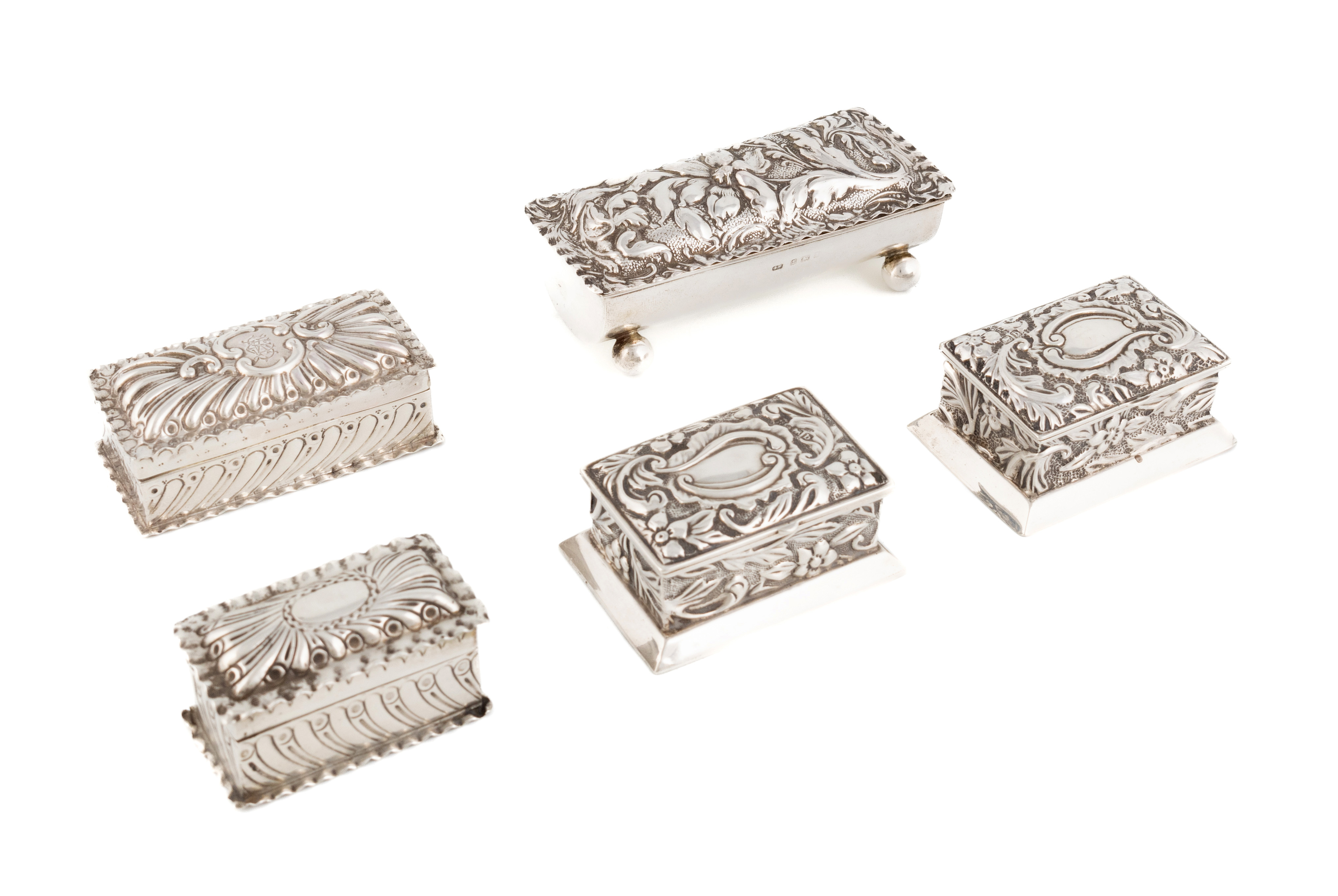 compromising: a pair by Gibson & Langman, London 1897, with embossed scroll foliate decoration, with vacant cartouches, two by William Comyns & Sons, London 1886 and 1890, both with wavy edge borders and embossed scroll decoration, one engraved with an initial monogram, and one by George Randle, Birmingham 1908, with an embossed foliate cover, on four ball feet, length 10cm, total approx. weight 9.7oz. (5)