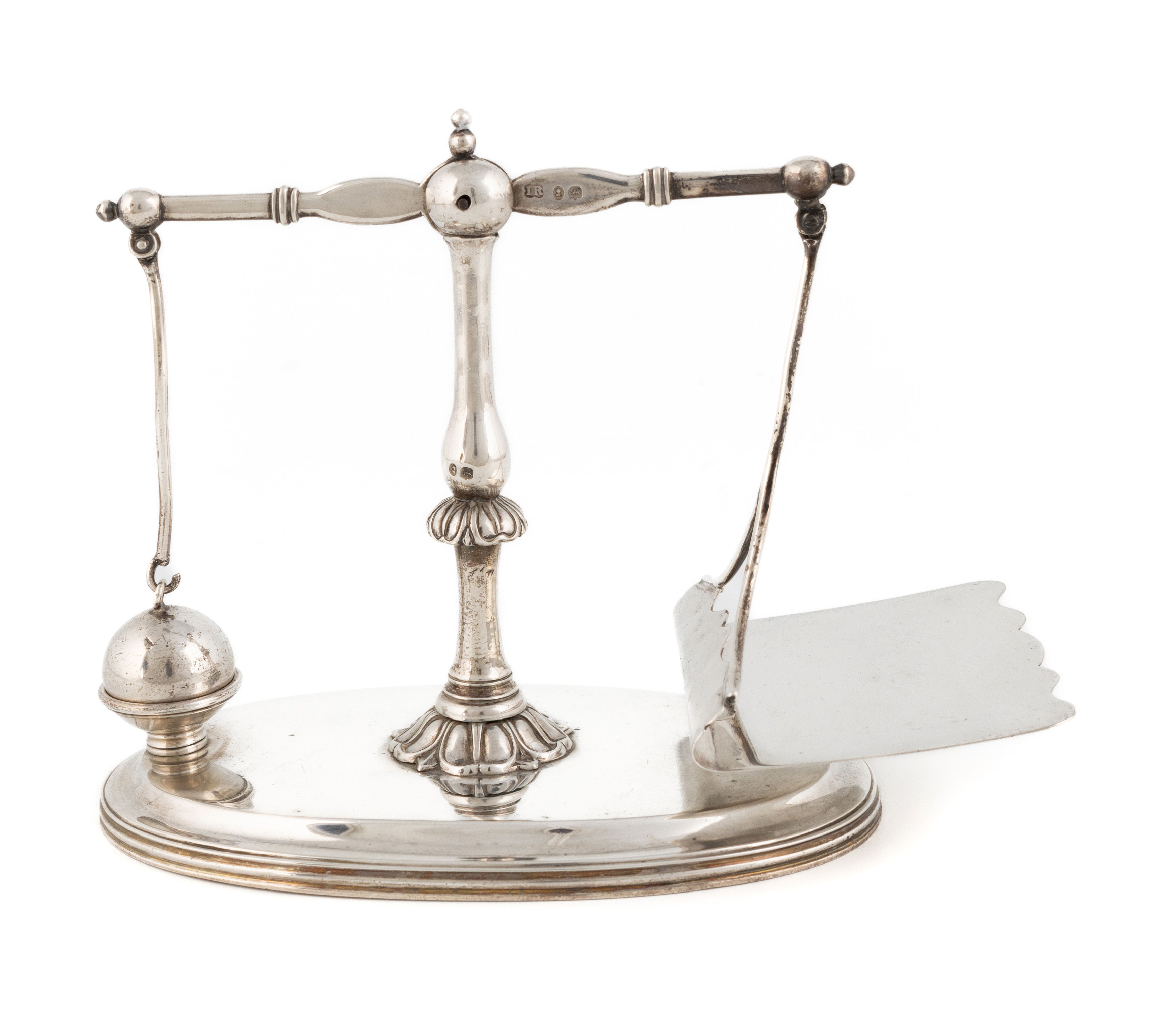 knopped baluster stem with lobed decoration, wavy-edge platform and a plated ball weight, on an oval base, length of base 13.1cm, approx. weight 7.7oz.