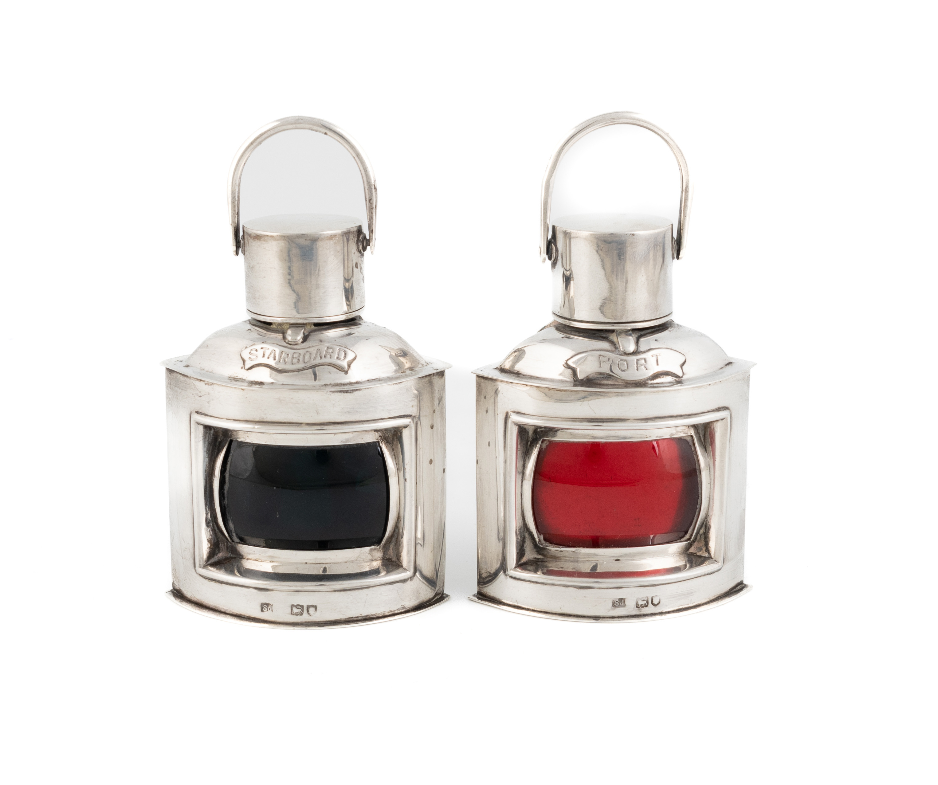 A pair of late-Victorian novelty silver 'Port' & 'Starboard' ship lantern inkwells,