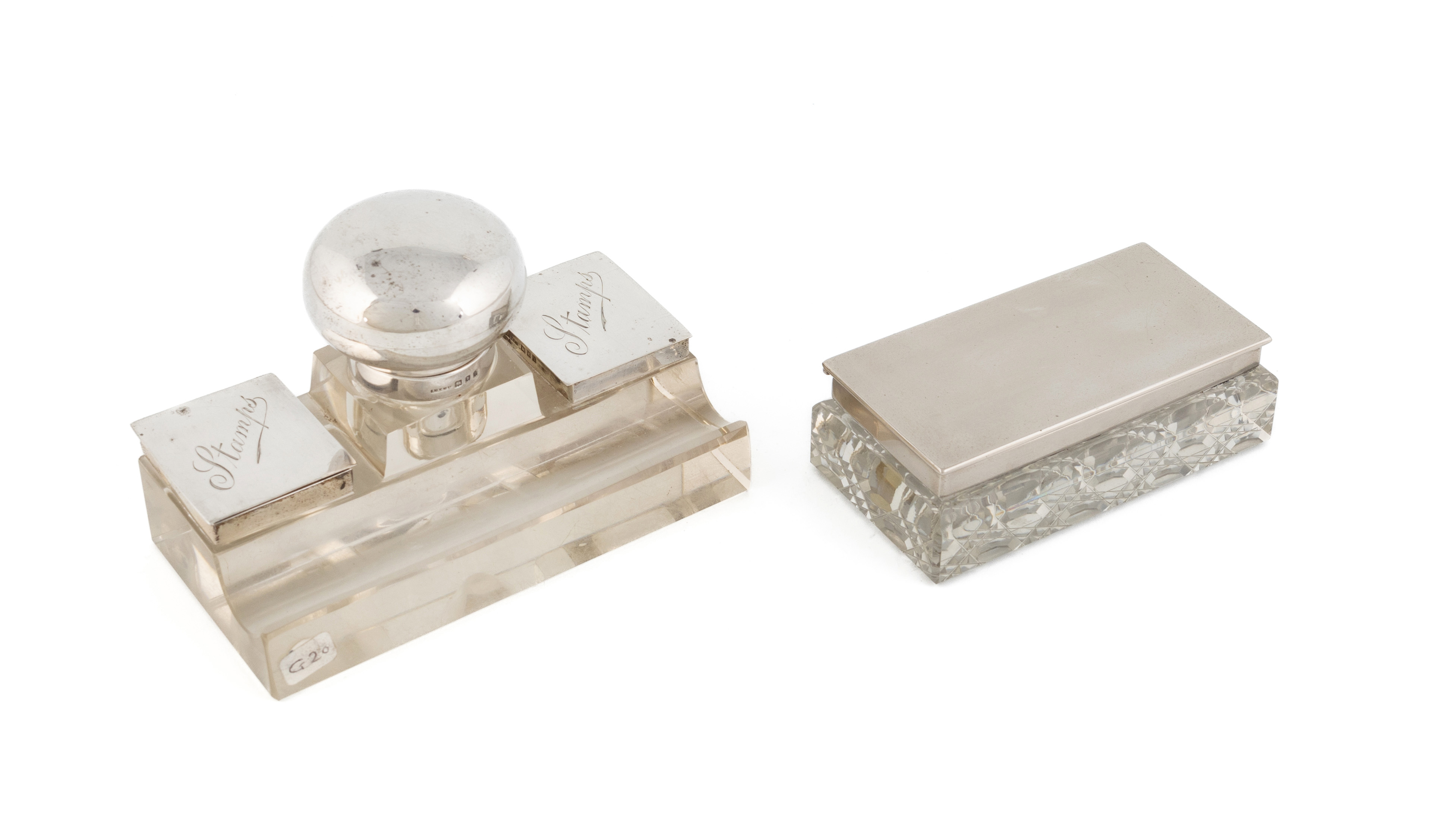 rectangular form, with a pen tray, two stamp compartments with the covers engraved 'Stamps', and inkwell, length 13cm, plus an unmarked mounted glass stamp box. (2)