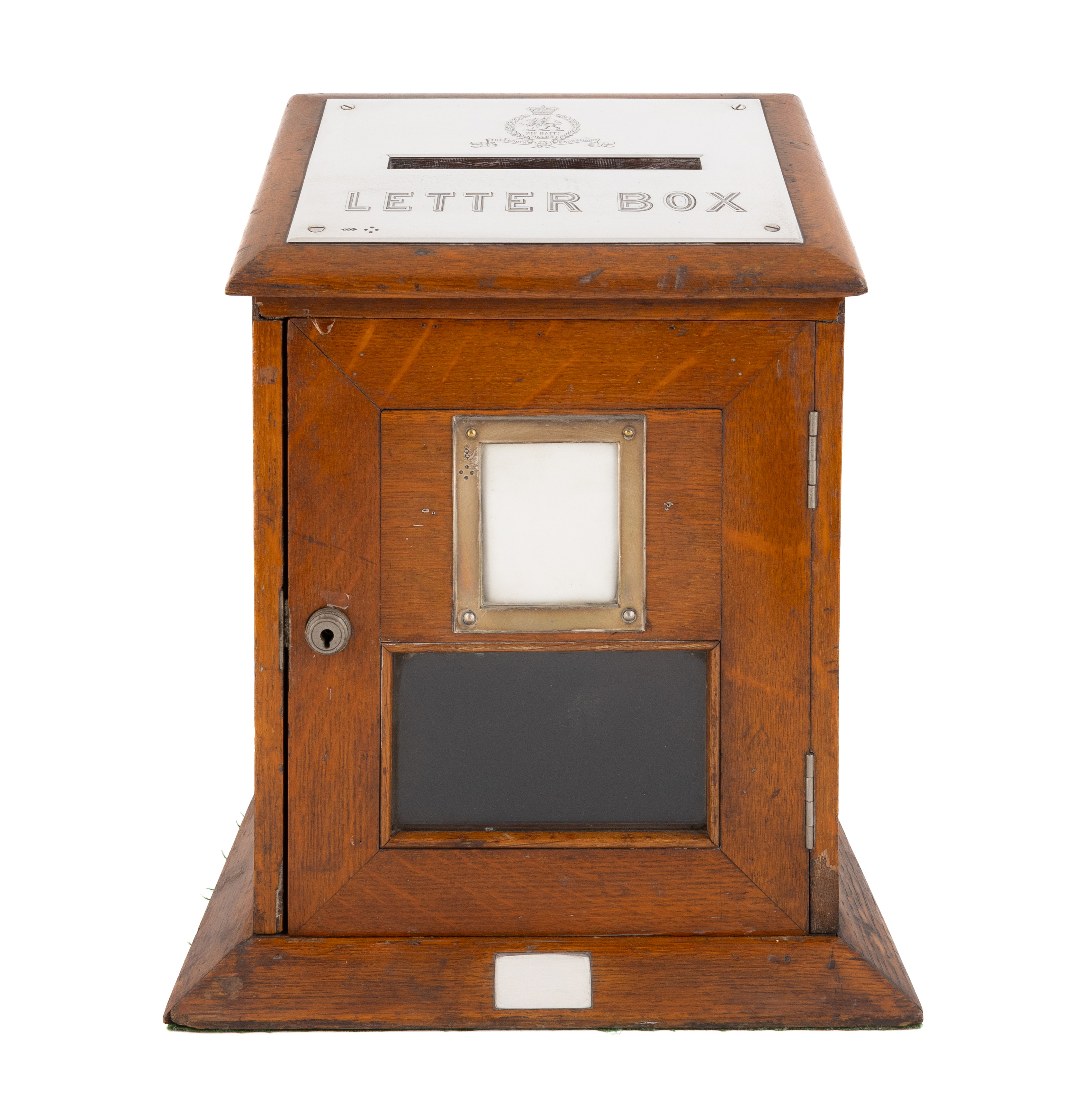 rectangular form, the mount inscribed 'Letter Box' and engraved with 3rd Battalion, The South Wales Borderer's crest and motto, the front with a hinged door and mounted panel and glass window, height 35.7cm.