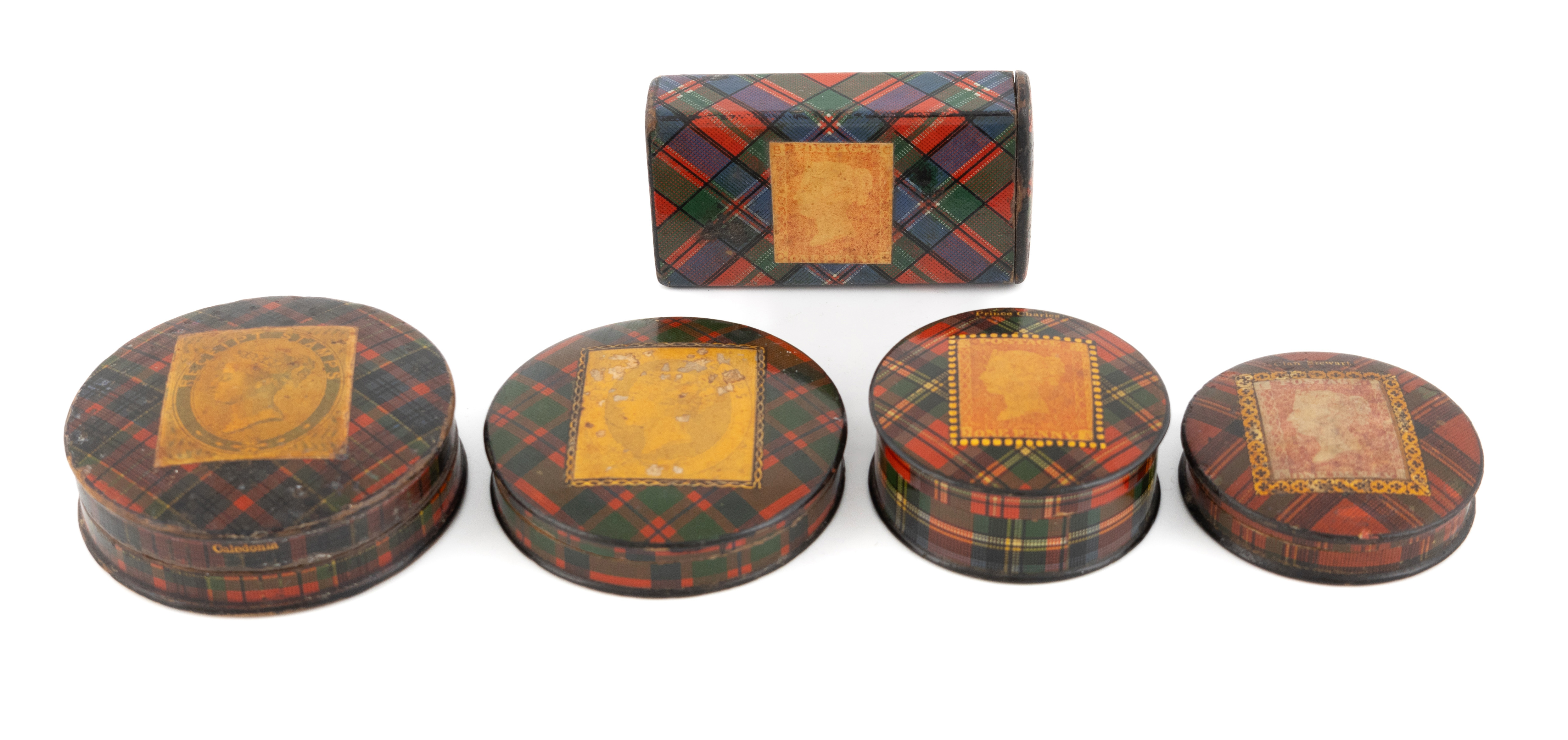 all with stamps to the covers, one of circular form with Prince Charles tartan, three other similar with one having Clan Stewart tartan and one of rectangular form with Macfarlane tartan, length 6cm. (5)