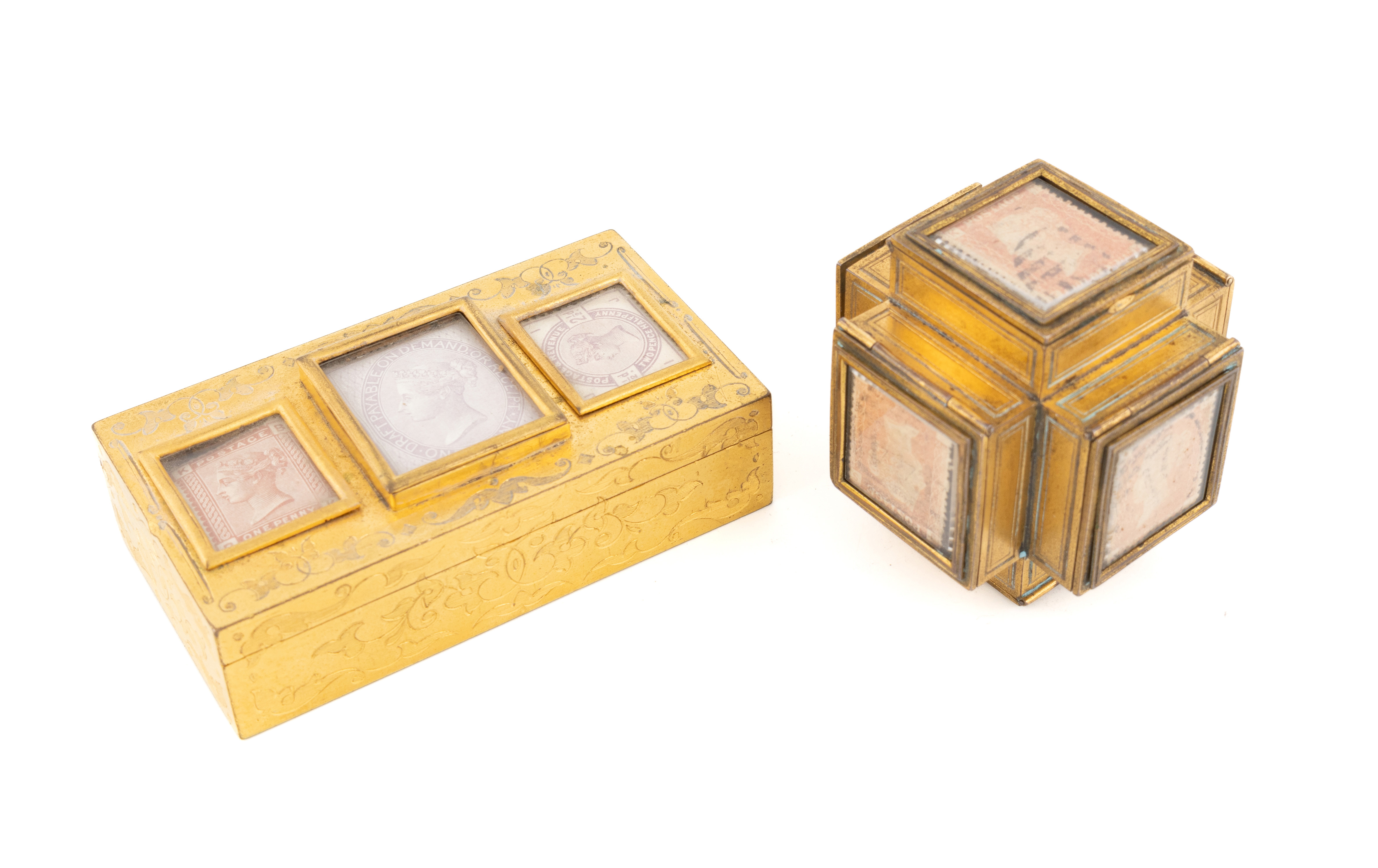 rectangular form with engraved scroll foliate decoration, the cover with three windowed glass stamp compartments, length 9.2cm, the other of cube form with glass hinged compartments to each side. (2)