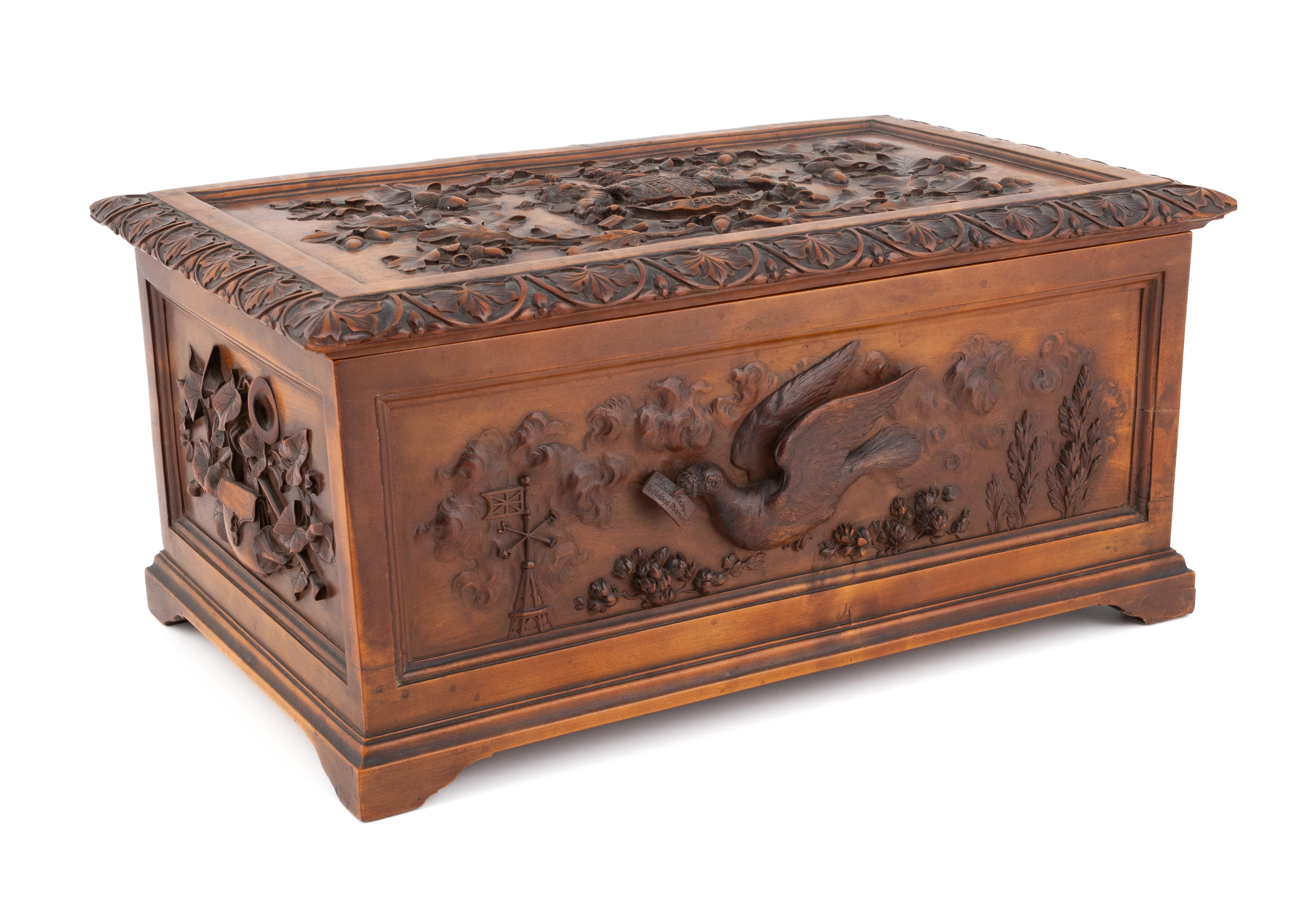 rectangular form with an ivy leaf border, the cover with the arms of Lord Foley with surrounding acorn and oak decoration, the sides with motifs of trumpets, post bags and leaves, the front carved with a pigeon carrying a letter inscribed 'The Lord Foley, Worksop Manor', on four bracket feet, length 31.8cm.