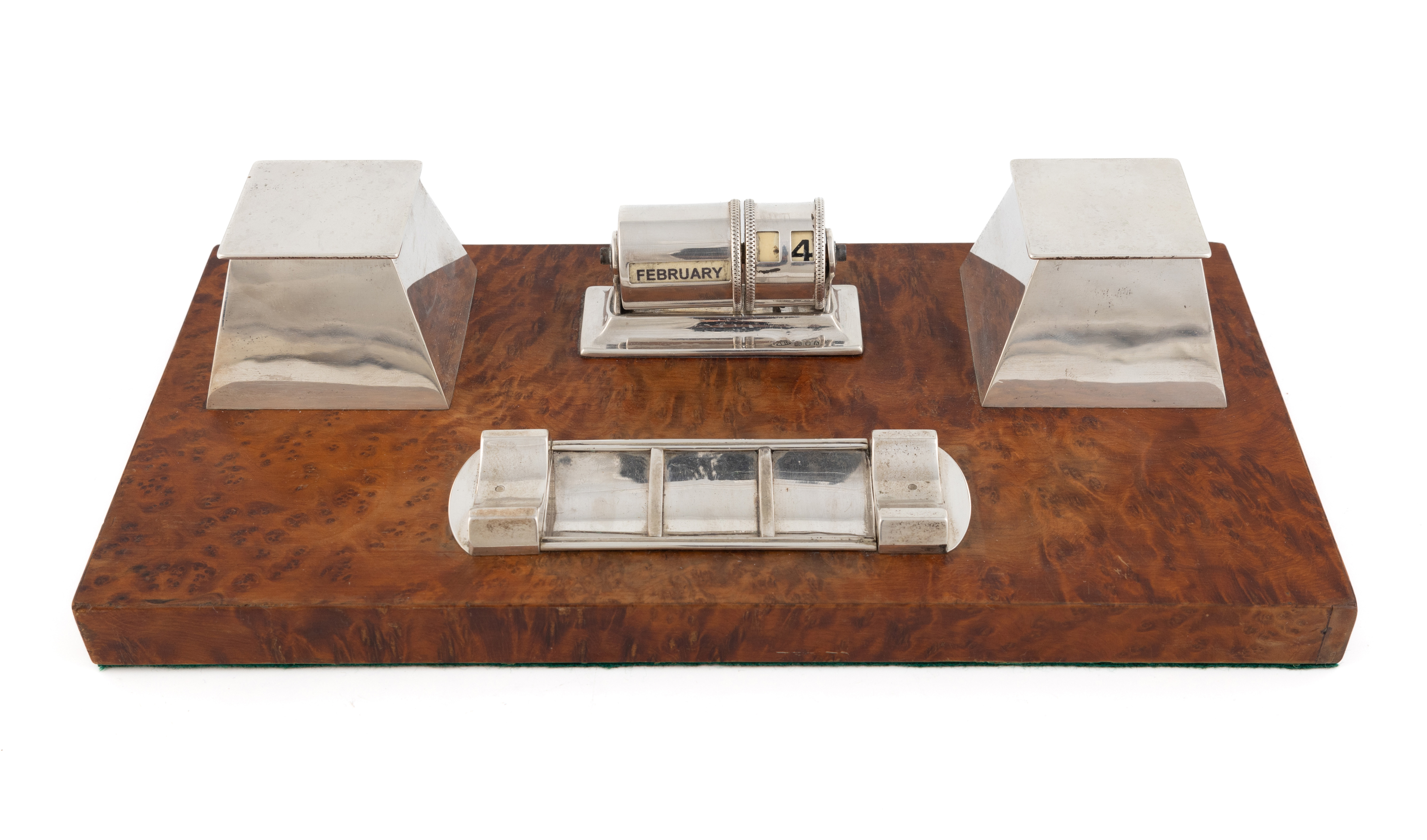 veneered rectangular base, with a pen tray and stamp compartment, two tapering square inkwells and a perpetual calendar, length 28.5cm.