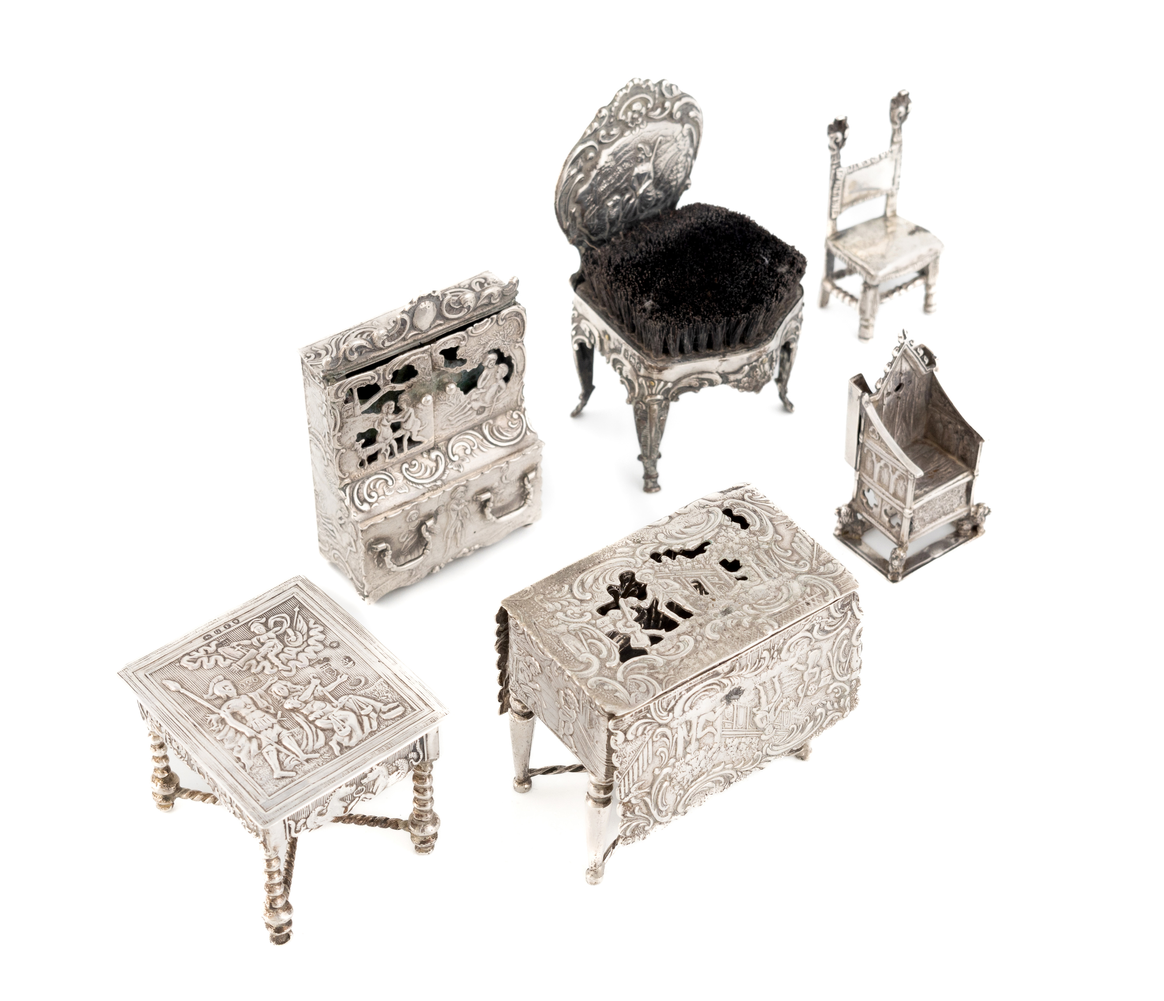 comprising: one modelled as a drop-leaf table, with a pierced cover and a stamp compartment, one modelled as a side table with barely-twist legs, the cover embossed with a mythological scene, with two stamp compartments, one modelled as a bookcase cabinet, with pierced hinged doors revealing stamp compartments, one as a chair with a brush seat, one as a chair, one modelled as the King Edward's Throne, with a stamp compartment to the back, total approx. weighable 10.1oz. (6)