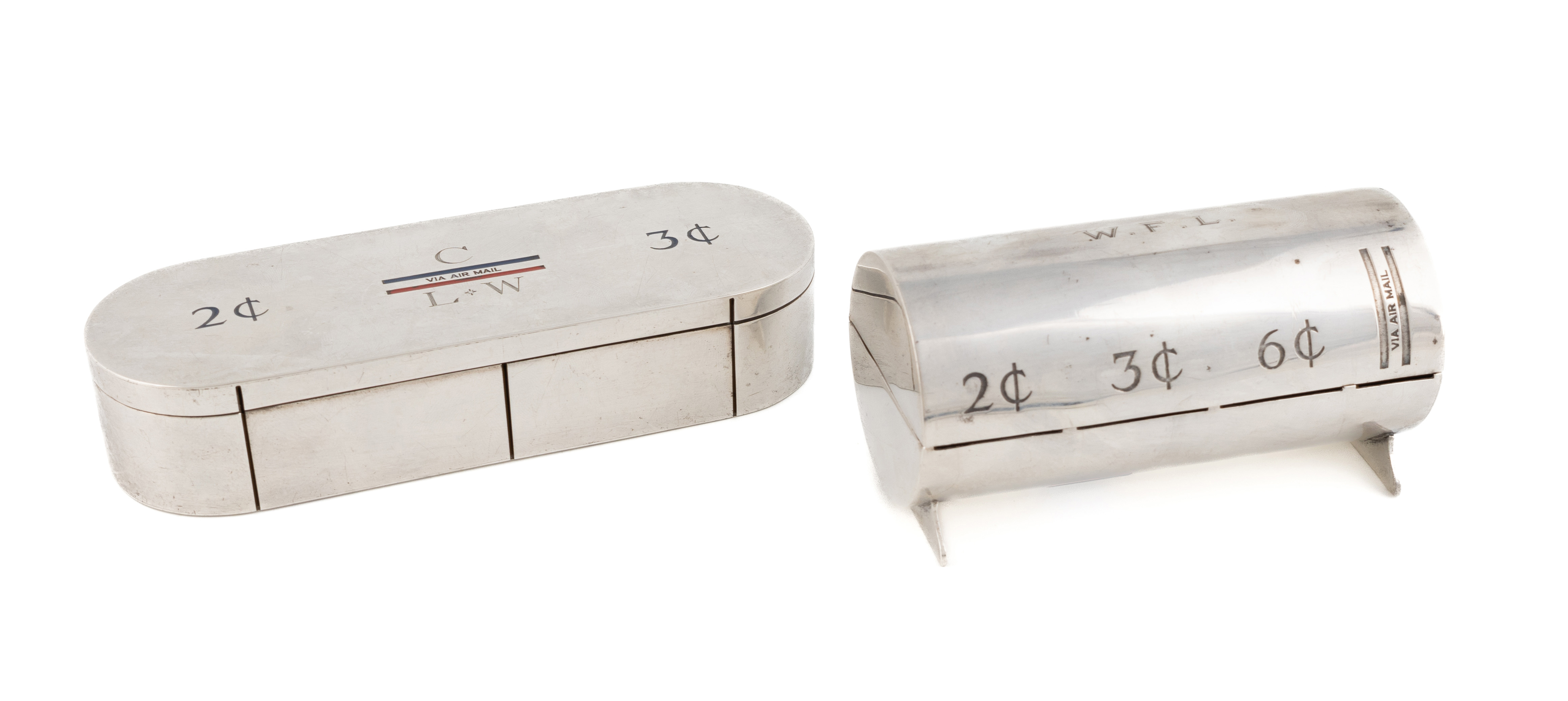 oblong form, three slits to the front side, engraved initials and '2¢ 3¢' on the cover, length 15cm, plus an American silver stamp dispenser, cylindrical form, engraved with initials and '2¢ 3¢ 6¢', total approx. weight 10.8oz. (2)