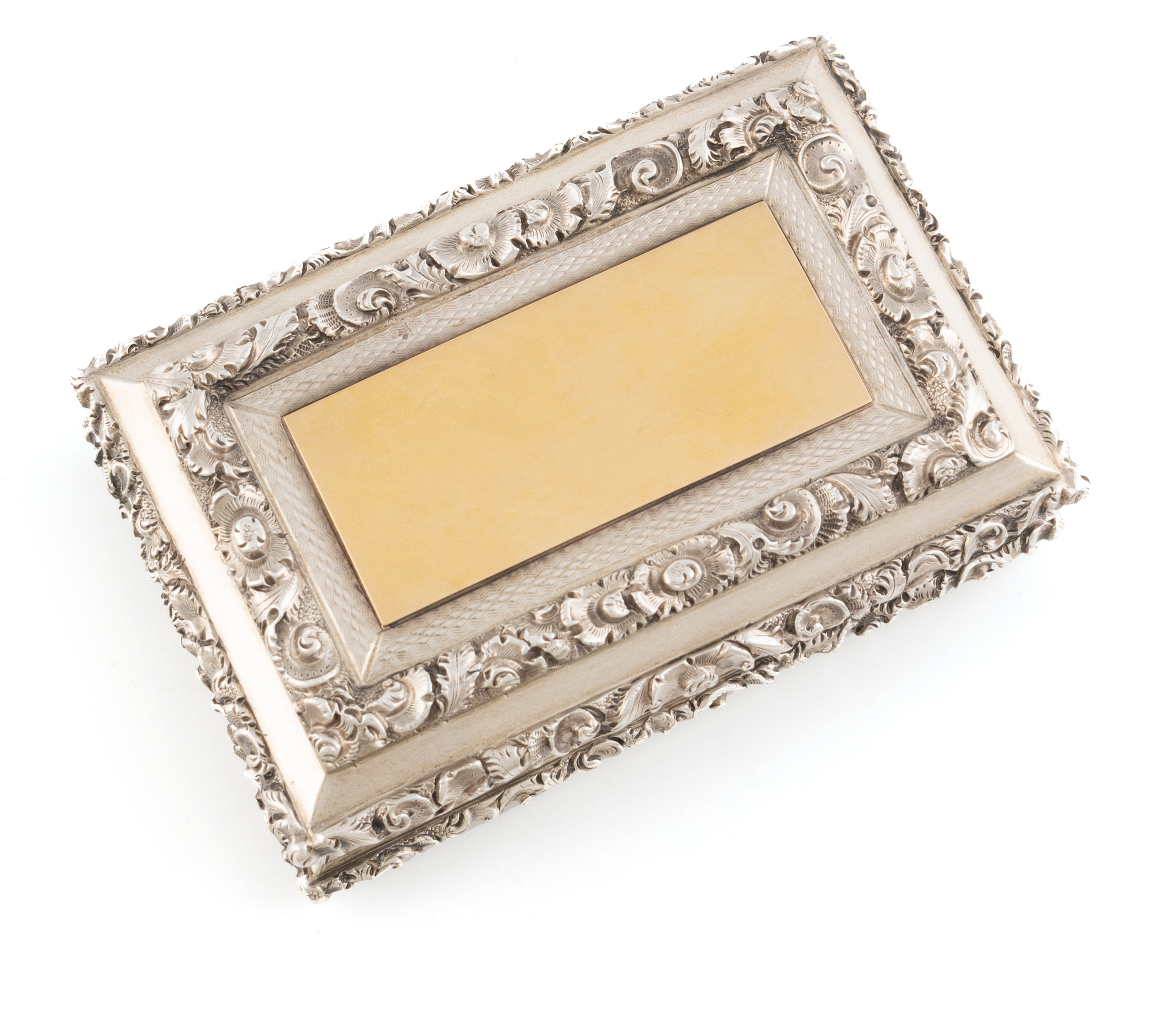 rectangular form with scroll foliate borders and engine-turned decoration, the cover with a silver-gilt panel, inscribed to the underside of the cover 'Presented to Mr William Goodsman. By a number of his friends in the Parish of Redgiton, Moneydie & Methven, as a token of their respect for his great & persevering executions in promoting the triumph of liberal principles in Perthshire 16th April 1835', length 8.5cm, approx. weight 5oz.