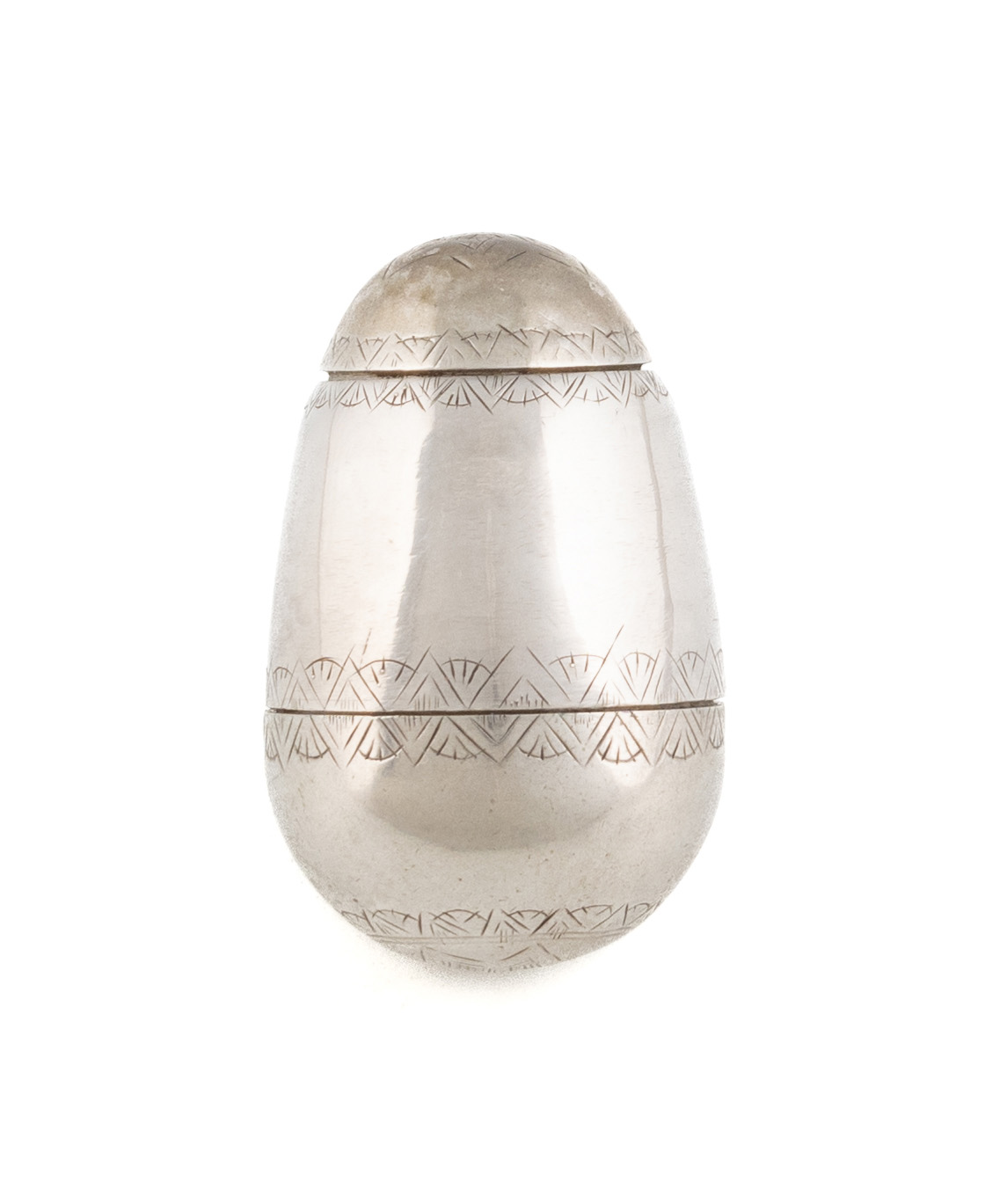 egg form, engraved borders, the interior with a steel grater, the front with a screw-off compartment, length 4.5cm, approx. weight 0.8oz.